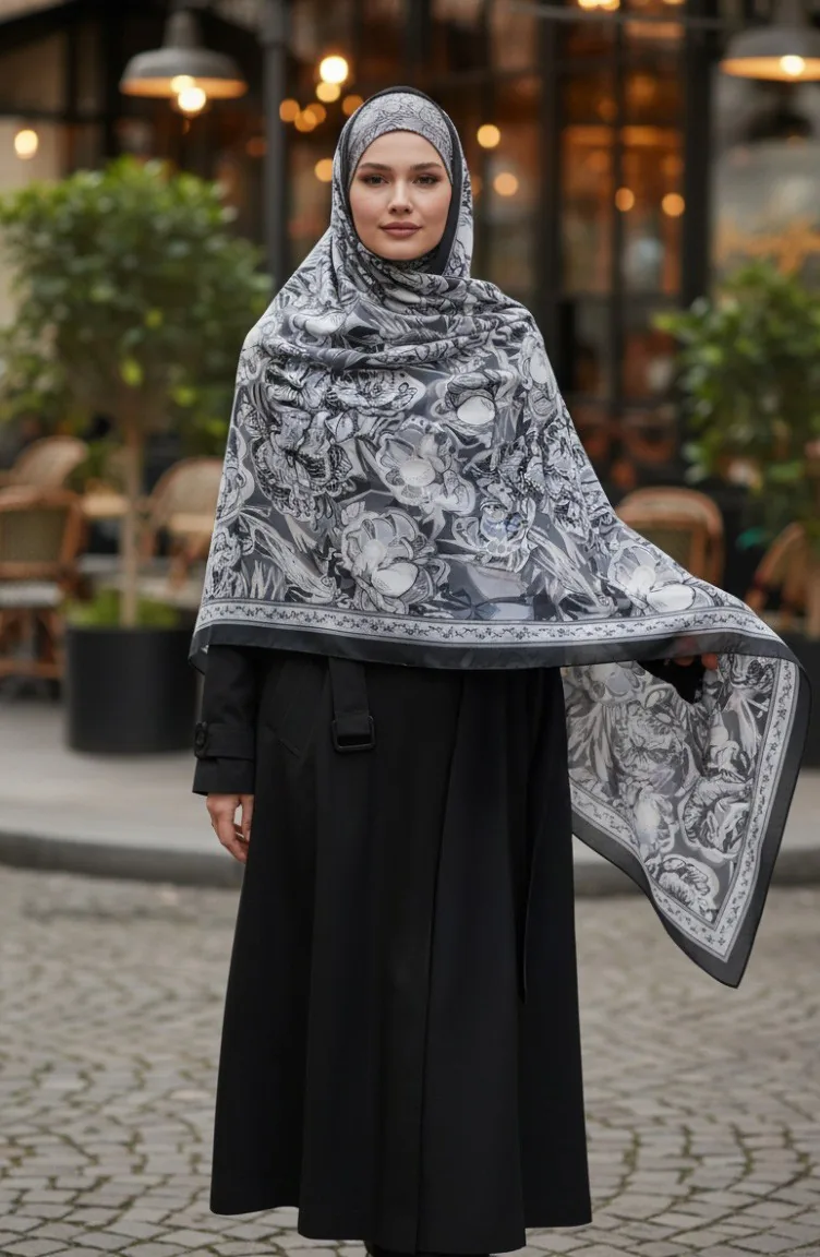 Pamuklu Desenli Koza Şal 70327-06 Siyah Gri