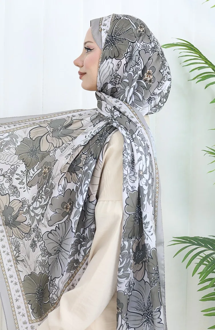 Şanzelize Çiçek Desenli Şal 70319-10 Gri Vizon