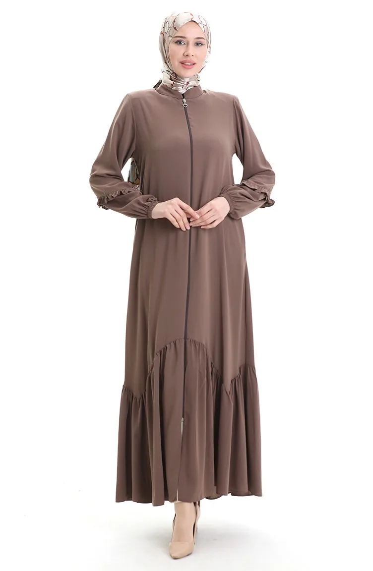 Zippered Hem And Gathered Abaya 5078-07 Milk Coffee 5078-07