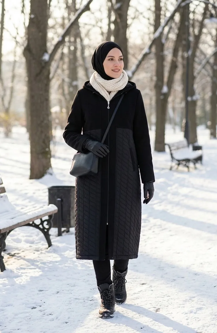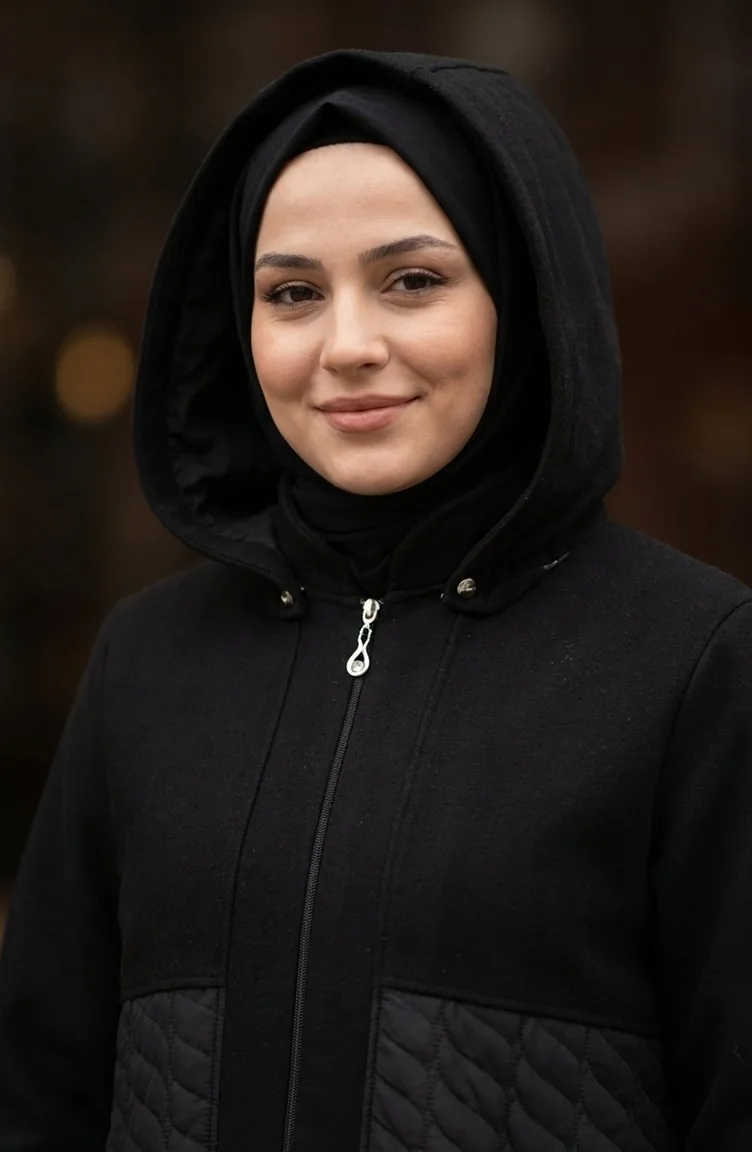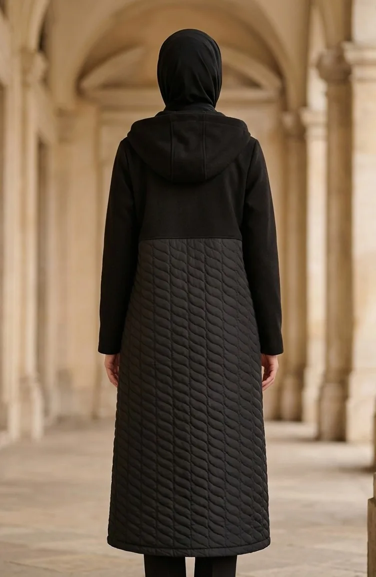 Black color is used. It is cachet fabric, you can use it easily in winter. It has a plain appearance. Since the fabric thickness of the model is in the middle level, the liner is used. Designed from thick fabric. Plus size option available.