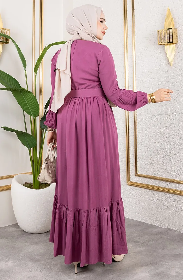 Belt Detailed Hijab Dress 0220-09 Powder 0220-09
