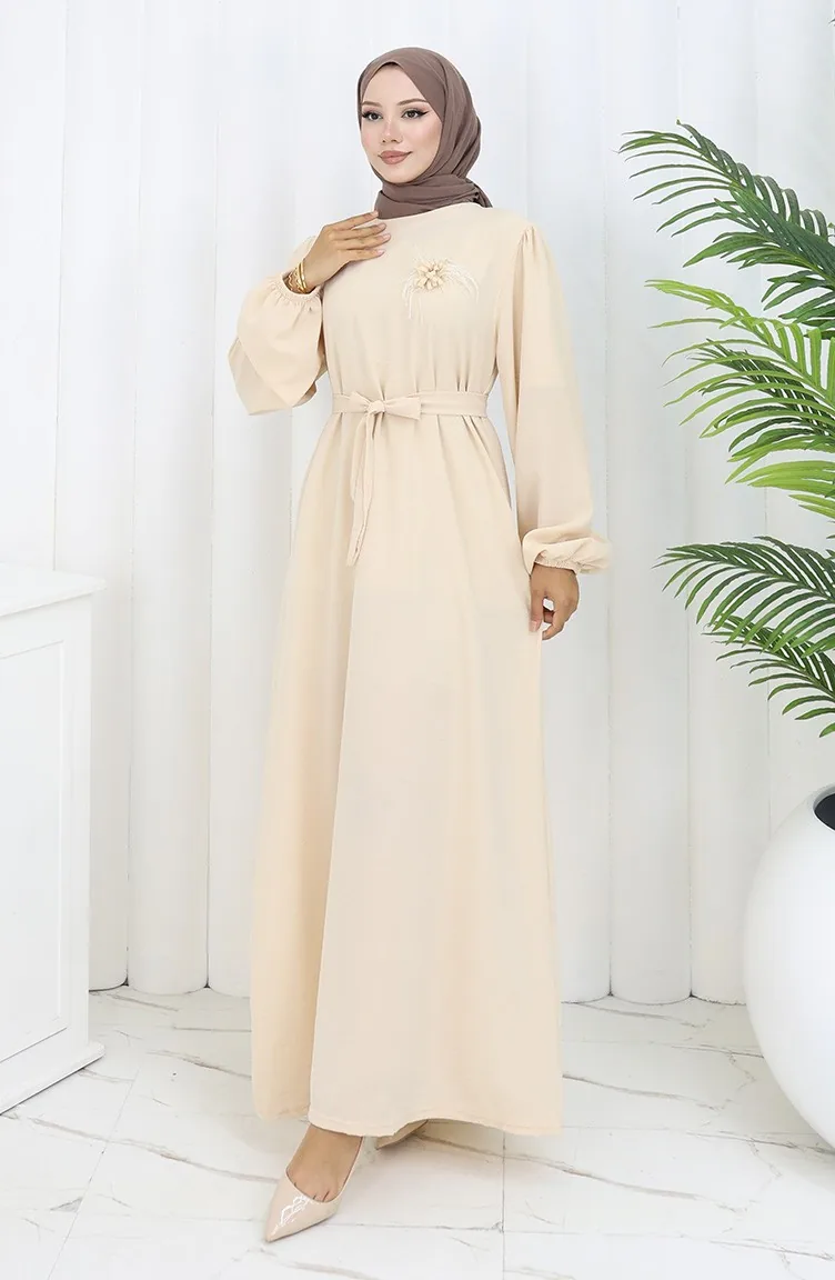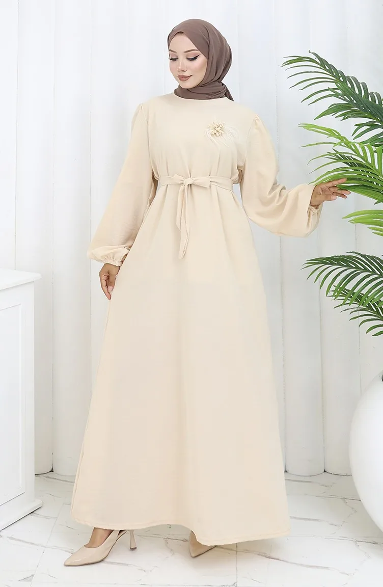 Brooch Detailed Dress 0017-05 Beige 0017-06