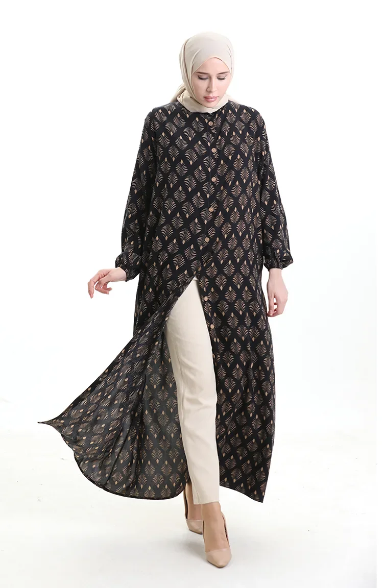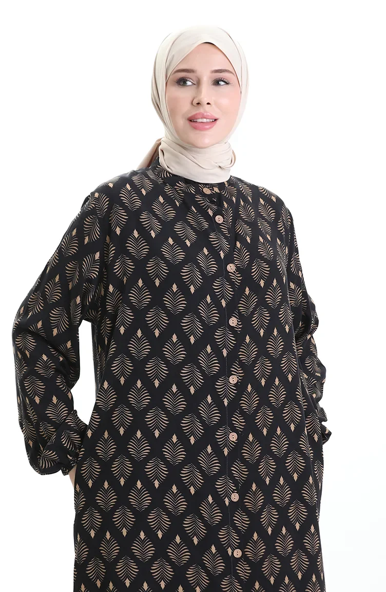 Black color is used. Viscose is a type of synthetic fabric and is convenient to use. Designed with patterned fabric. Buttons have been used to make it easy to use. It's made of elastic sleeves. Tippet collar is prefered. Suitable for 4 seasons. Plus size option available.