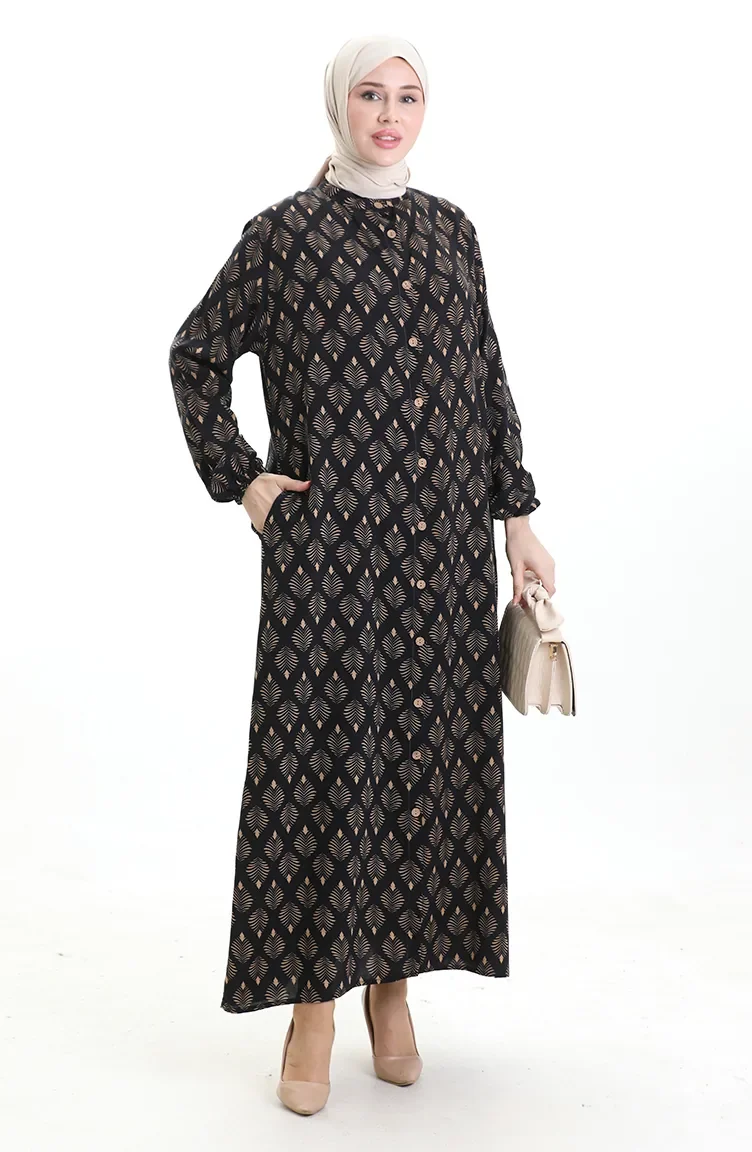 Buttoned Patterned Dress 0124-04 Black Beige 0124-04
