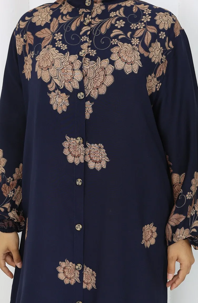 Viscose is a type of synthetic fabric and is convenient to use. Designed with patterned fabric. Buttons have been used to make it easy to use. It's made of elastic sleeves. Tippet collar is prefered. Suitable for 4 seasons. Rahat. Plus size option available.