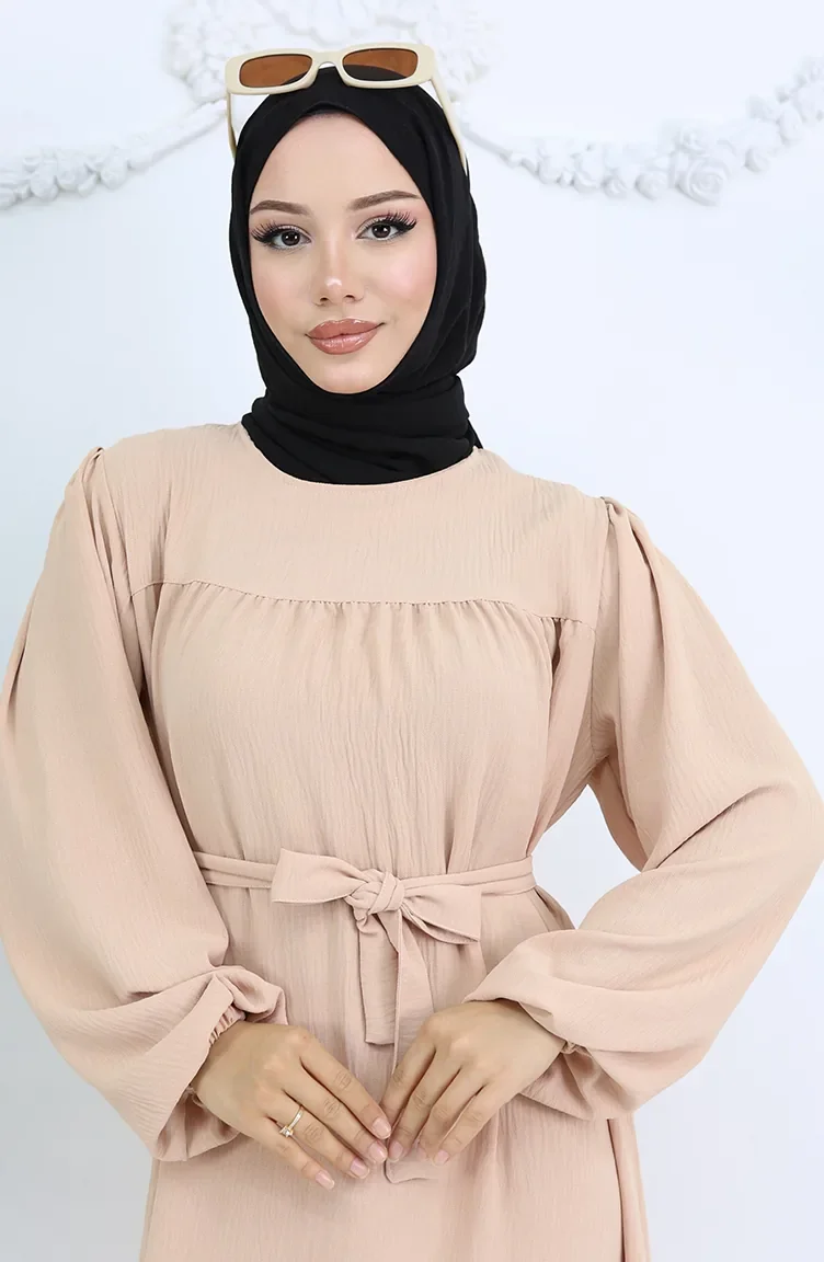 Crepe Fabric Elastic Sleeve Dress 0029-03 Beige 0029-03