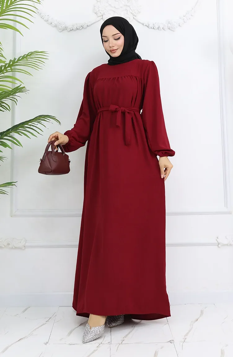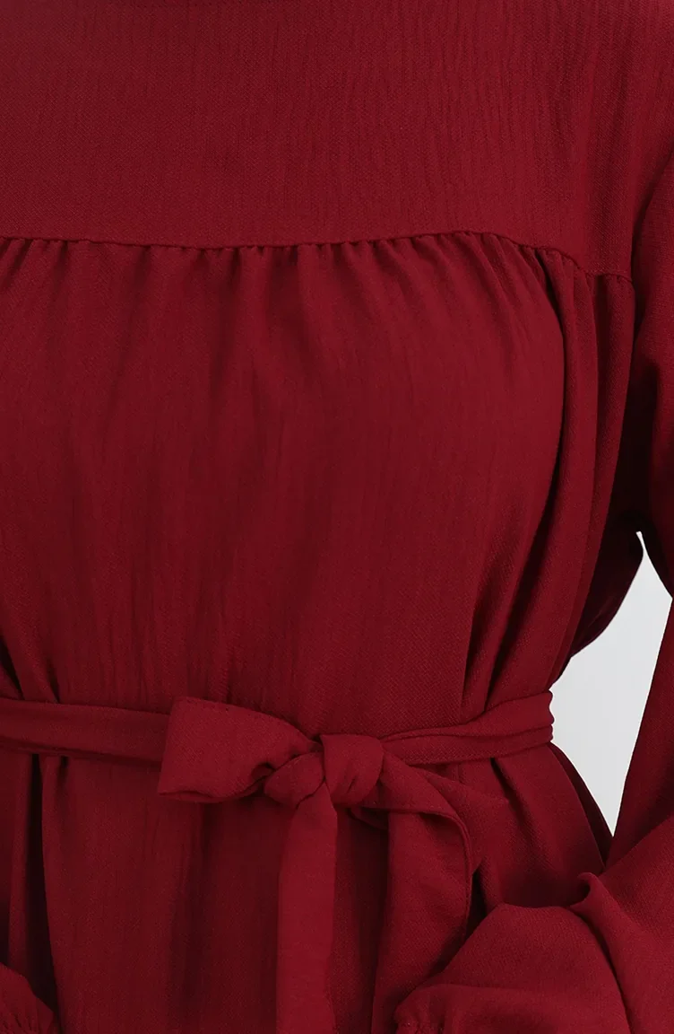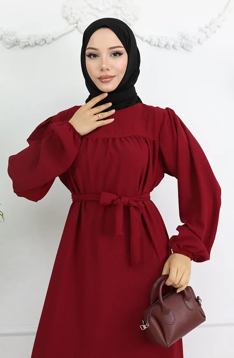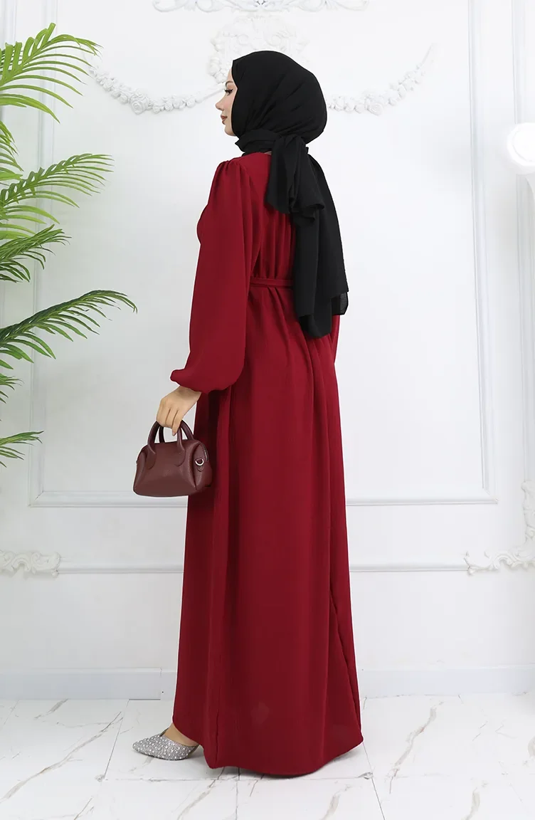 Crepe Fabric Elastic Sleeve Dress 0029-08 Claret Red 0029-08