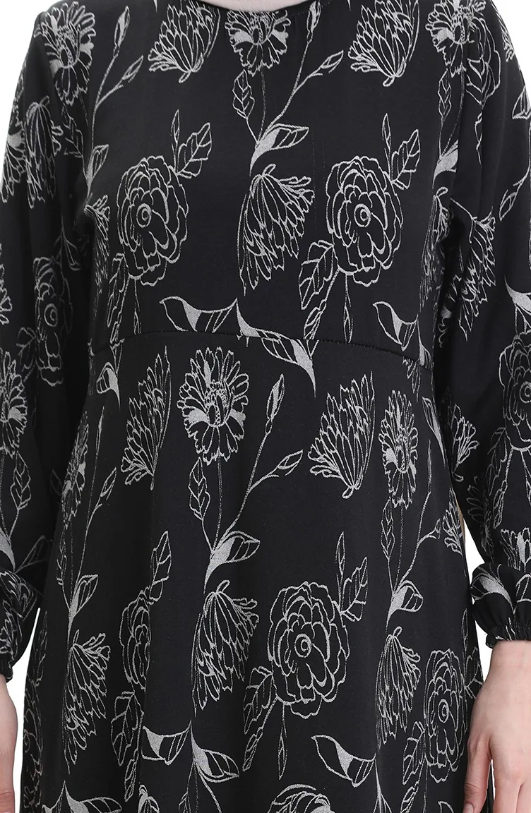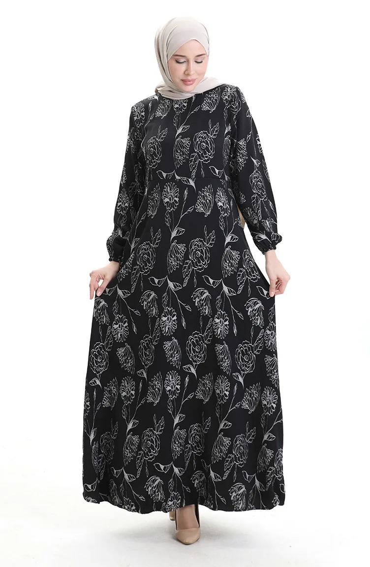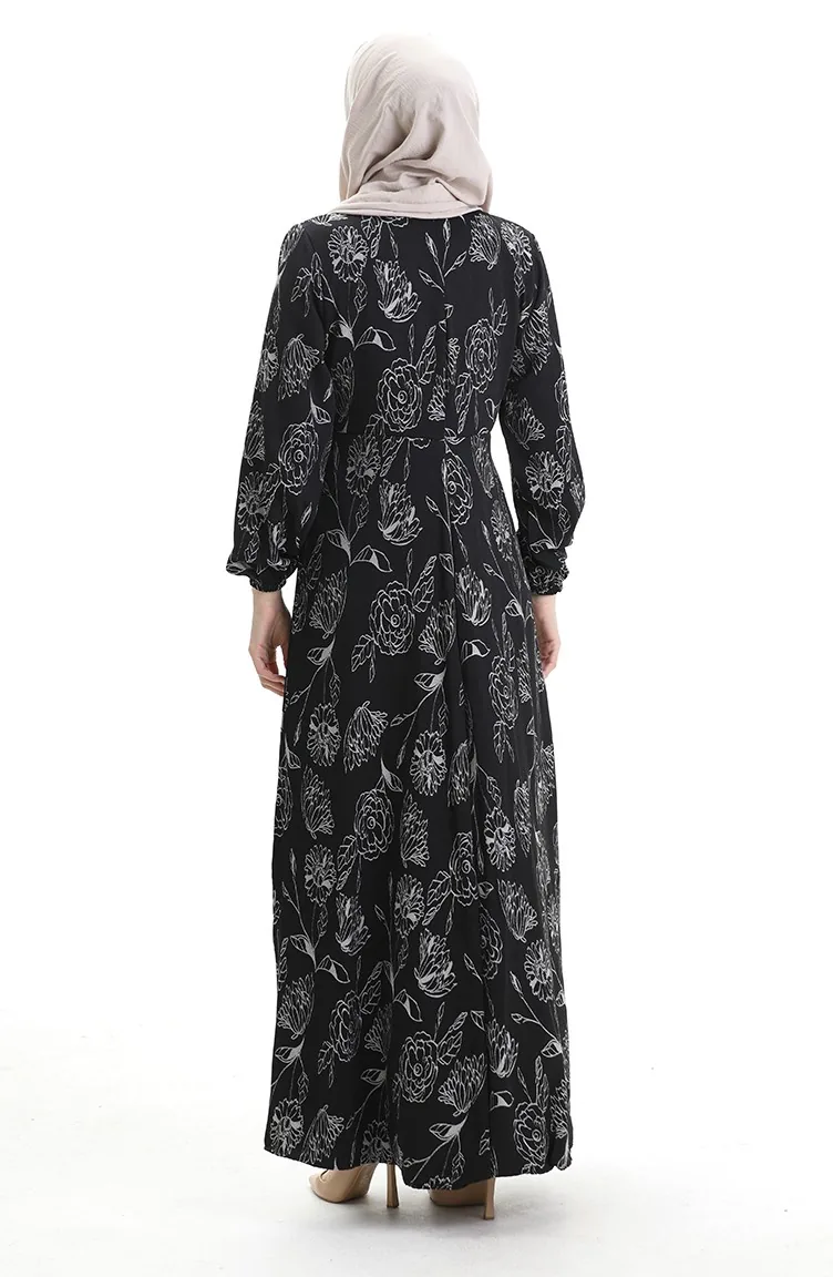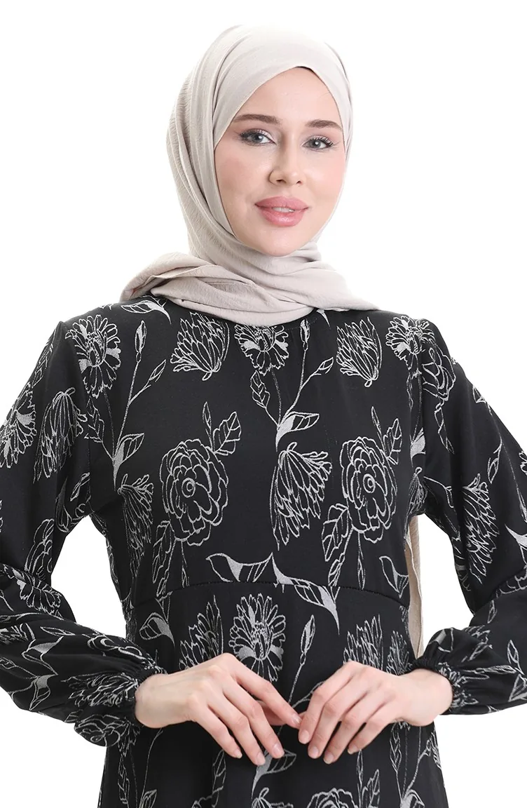 Elastic Sleeve Patterned Dress 2046-03 Black 2046-03