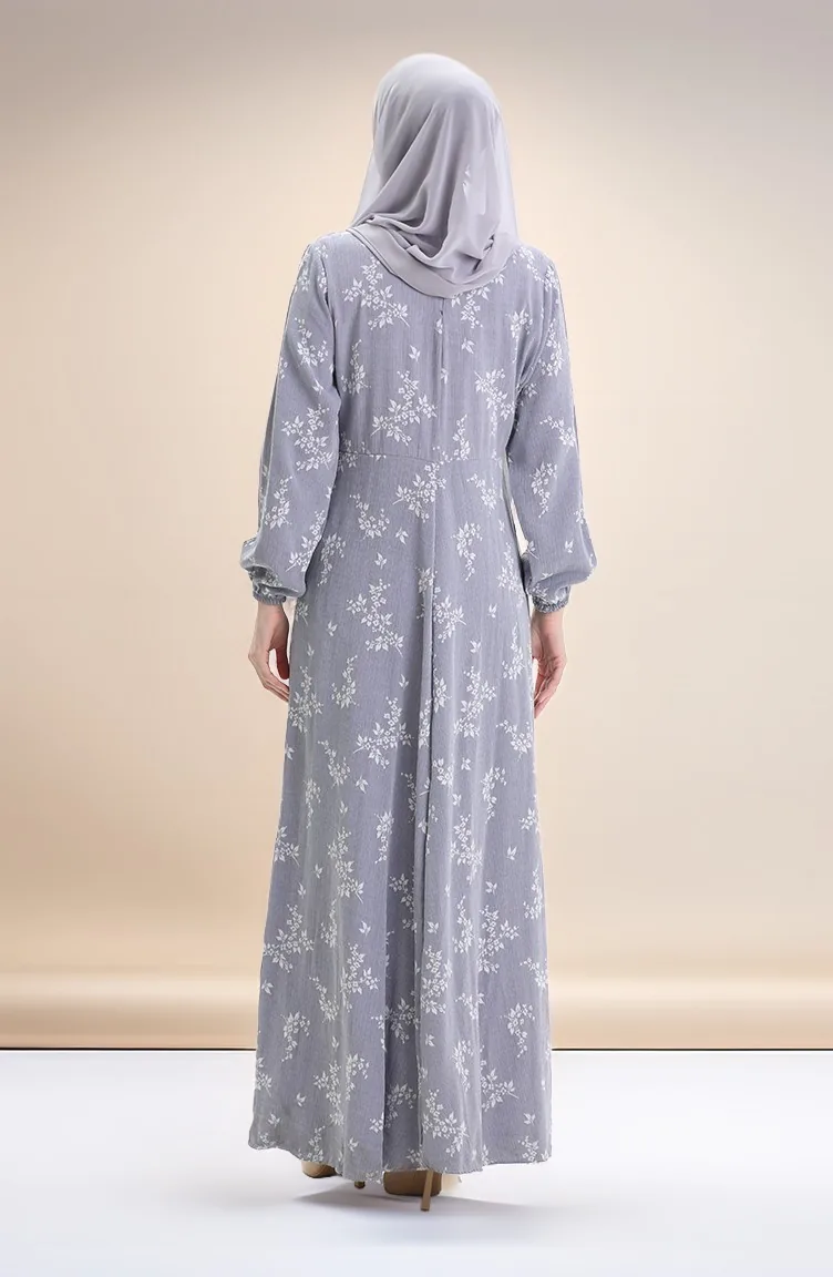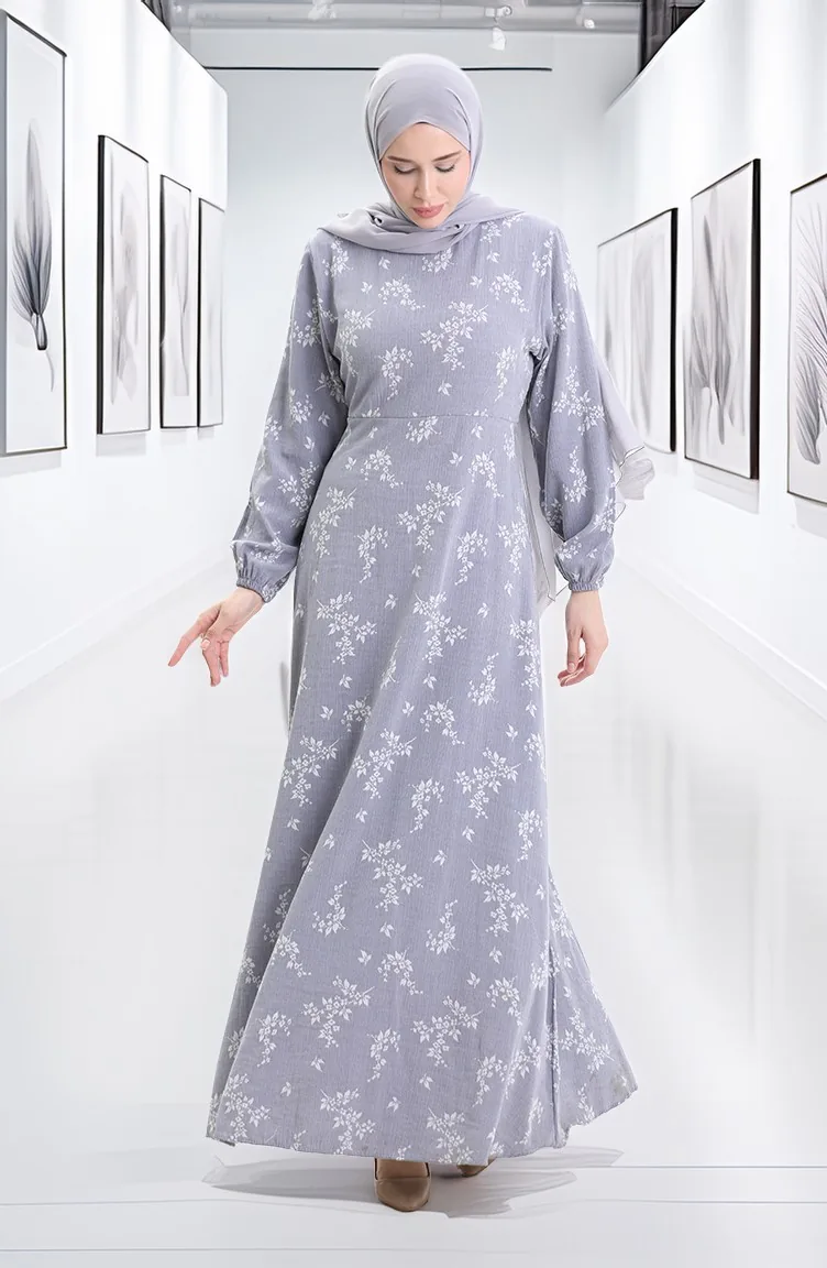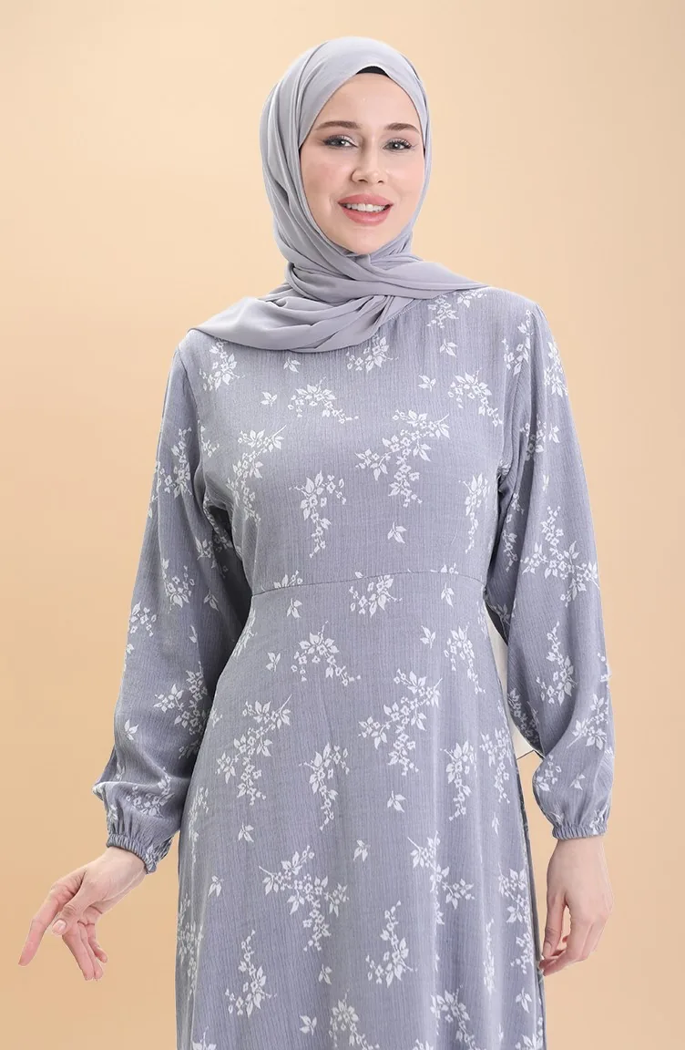 Elastic Sleeve Patterned Dress 2047-03 Light Gray 2047-03