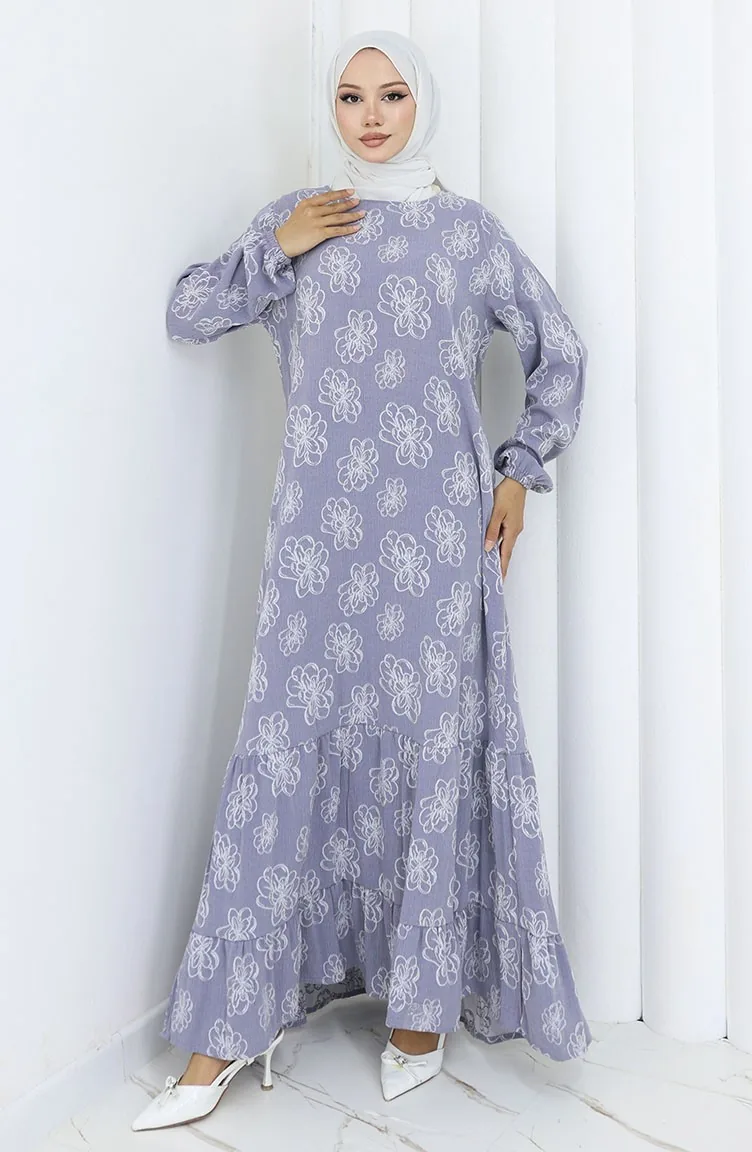 Elastic Sleeve Patterned Dress 2056-02 Silver Gray 2056-02