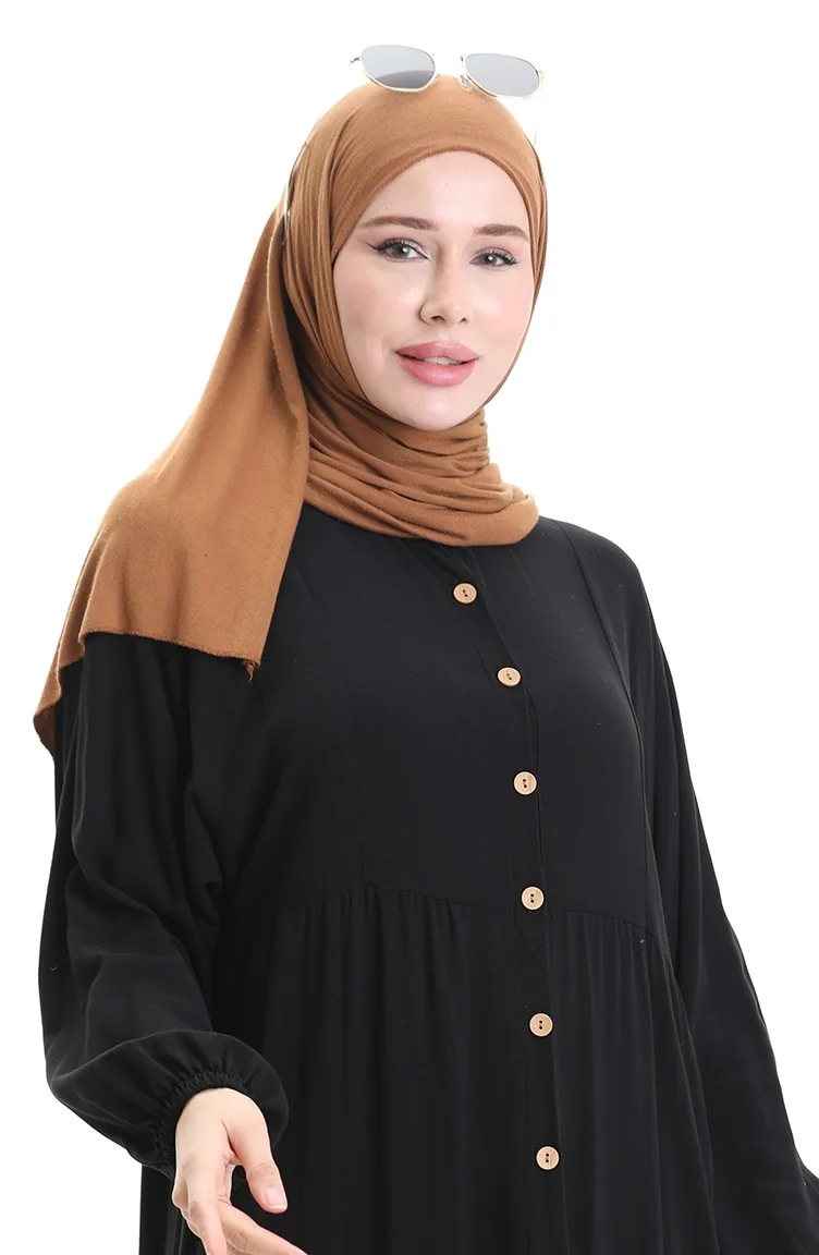 Black color is used. Viscose is a type of synthetic fabric and is convenient to use. It has a plain appearance. The product is used unlined. It's made of elastic sleeves. Tippet collar is prefered. Suitable for 4 seasons. Rahat. Plus size option available.