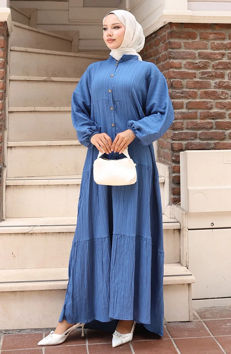 Half-Buttoned Elastic Sleeve Dress 2074-04 Indigo 2074-04