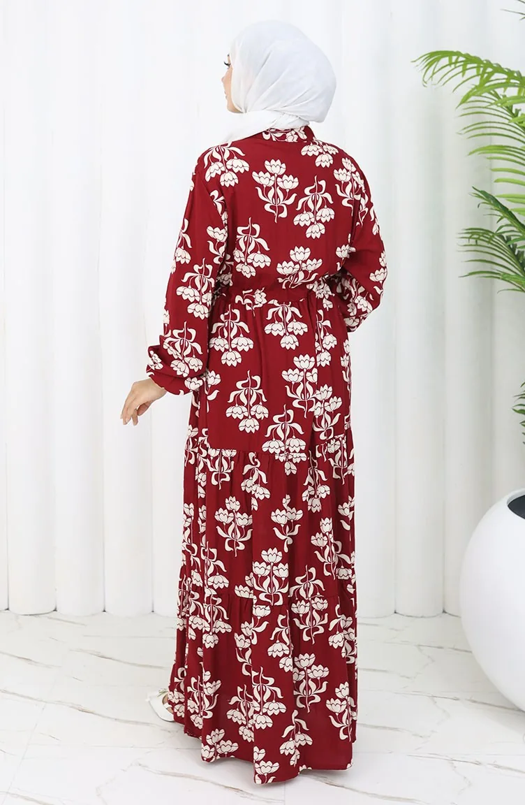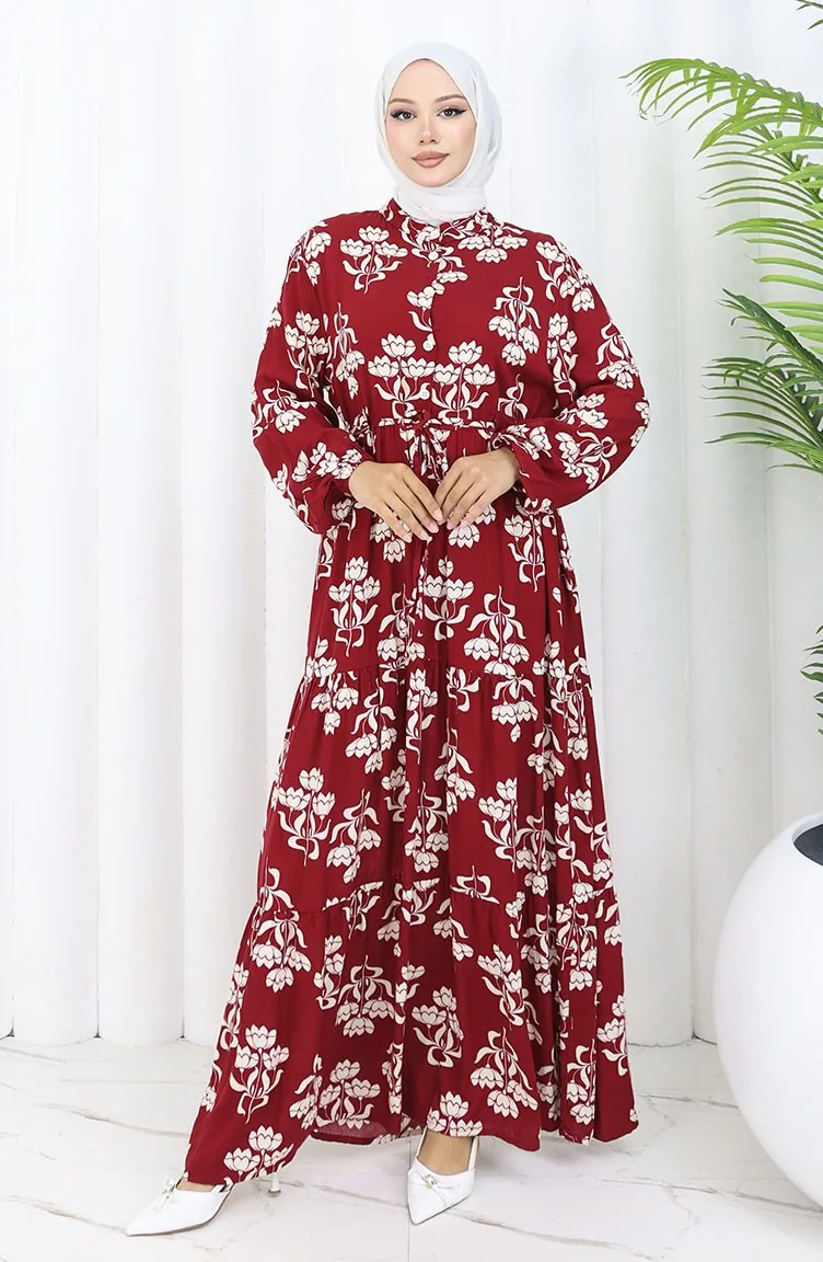 Half Buttoned Patterned Dress 2052-01 Claret Red 2052-01