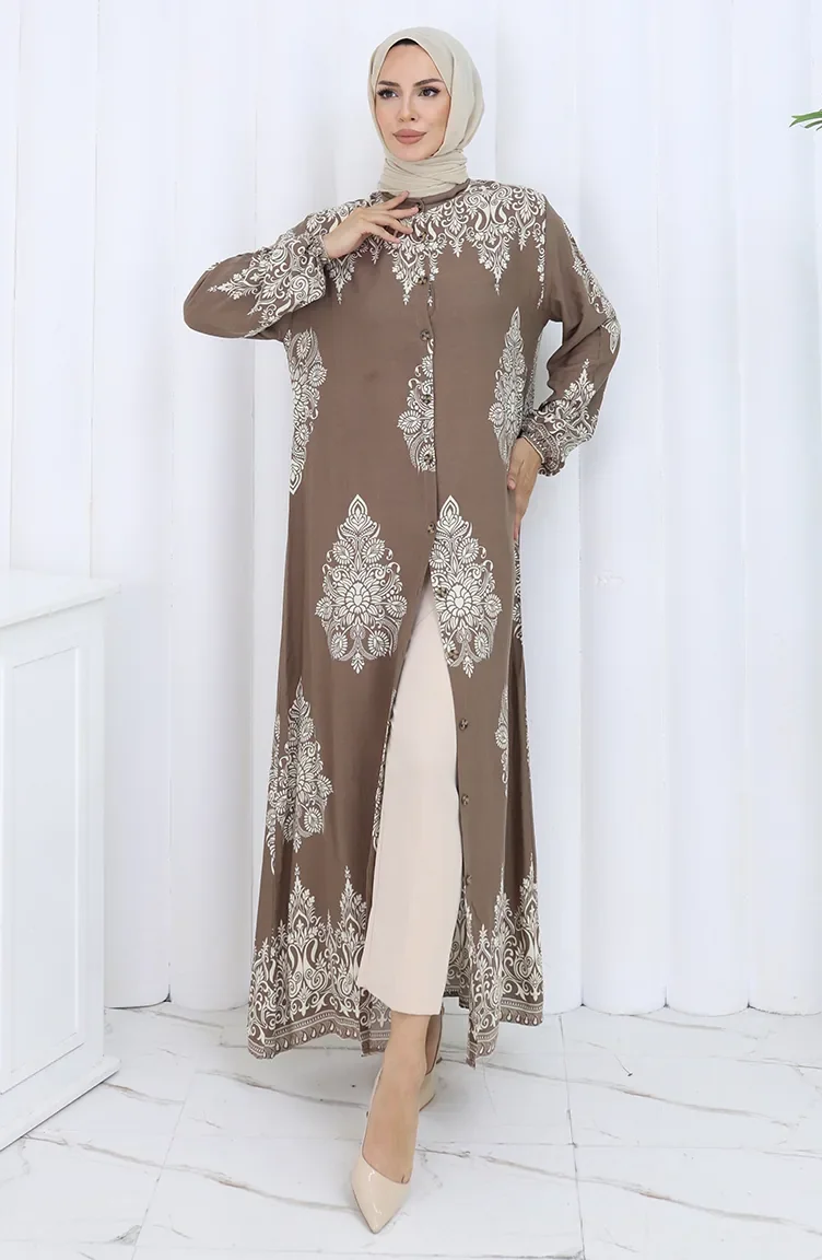 Viscose is a type of synthetic fabric and is convenient to use. Designed with patterned fabric. Buttons have been used to make it easy to use. It's made of elastic sleeves. Tippet collar is prefered. Suitable for 4 seasons. Plus size option available.
