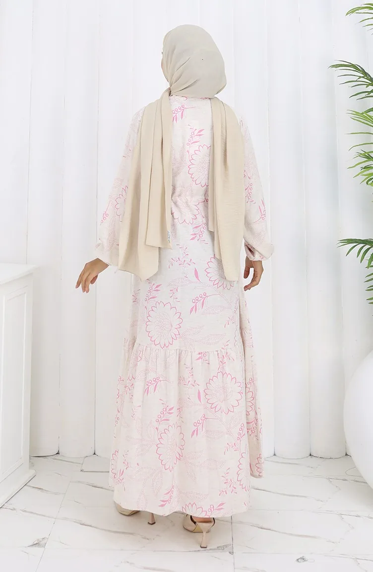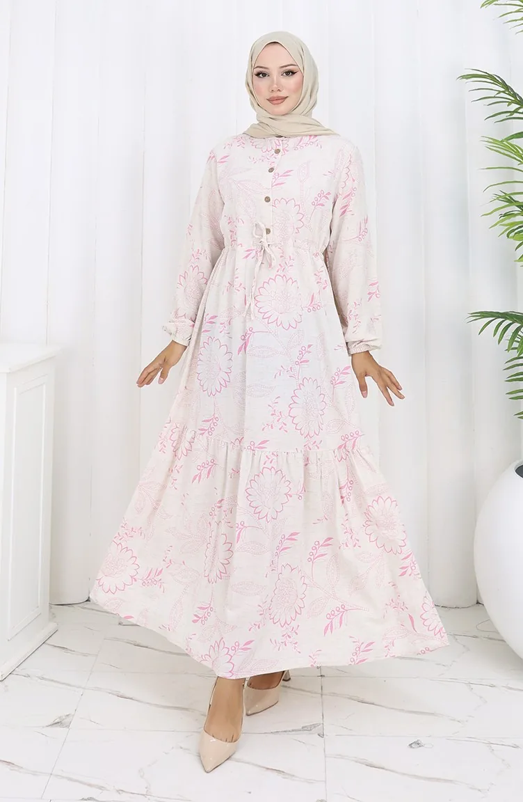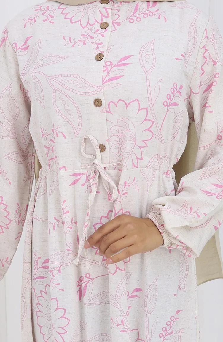 Linen Fabric Waist Tie-Down Buttoned Dress 0173A-01 Pink 0173A-01