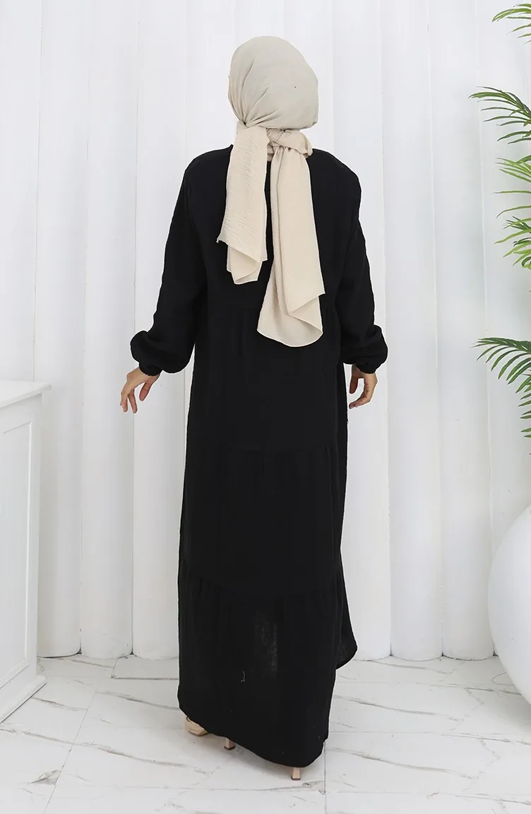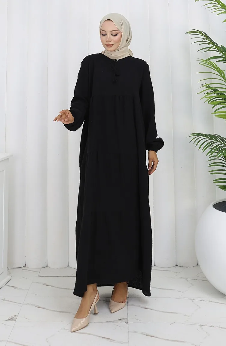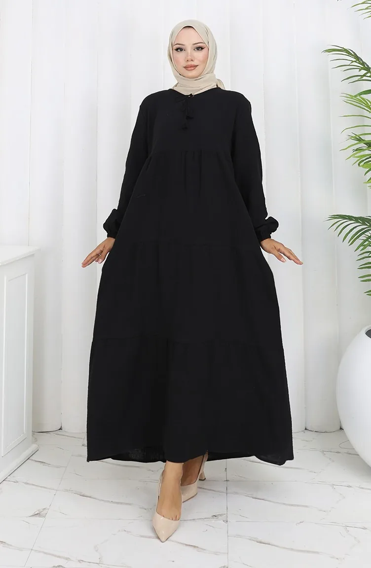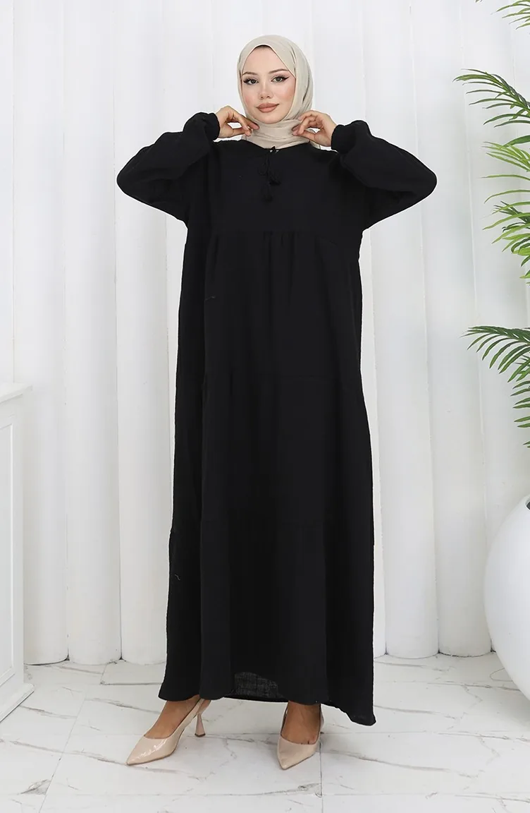 Black color is used. Viscose is a type of synthetic fabric and is convenient to use. It has a plain appearance. Since the fabric thickness of the model is in the middle level, the liner is used. It's made of elastic sleeves. Dik Yaka. Designed for summer use. The size worn by the model, is the one on the image.