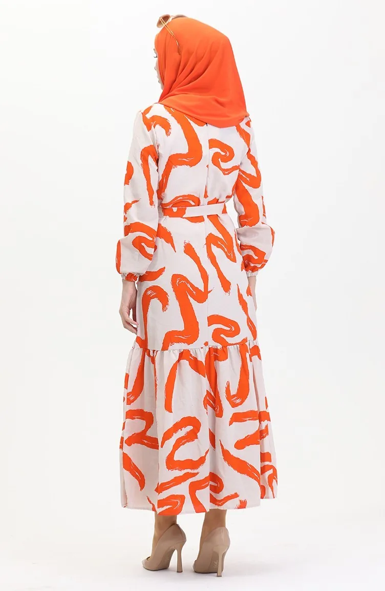 Patterned Belted Linen Dress 0471a-07 Beige Orange 0471A-07