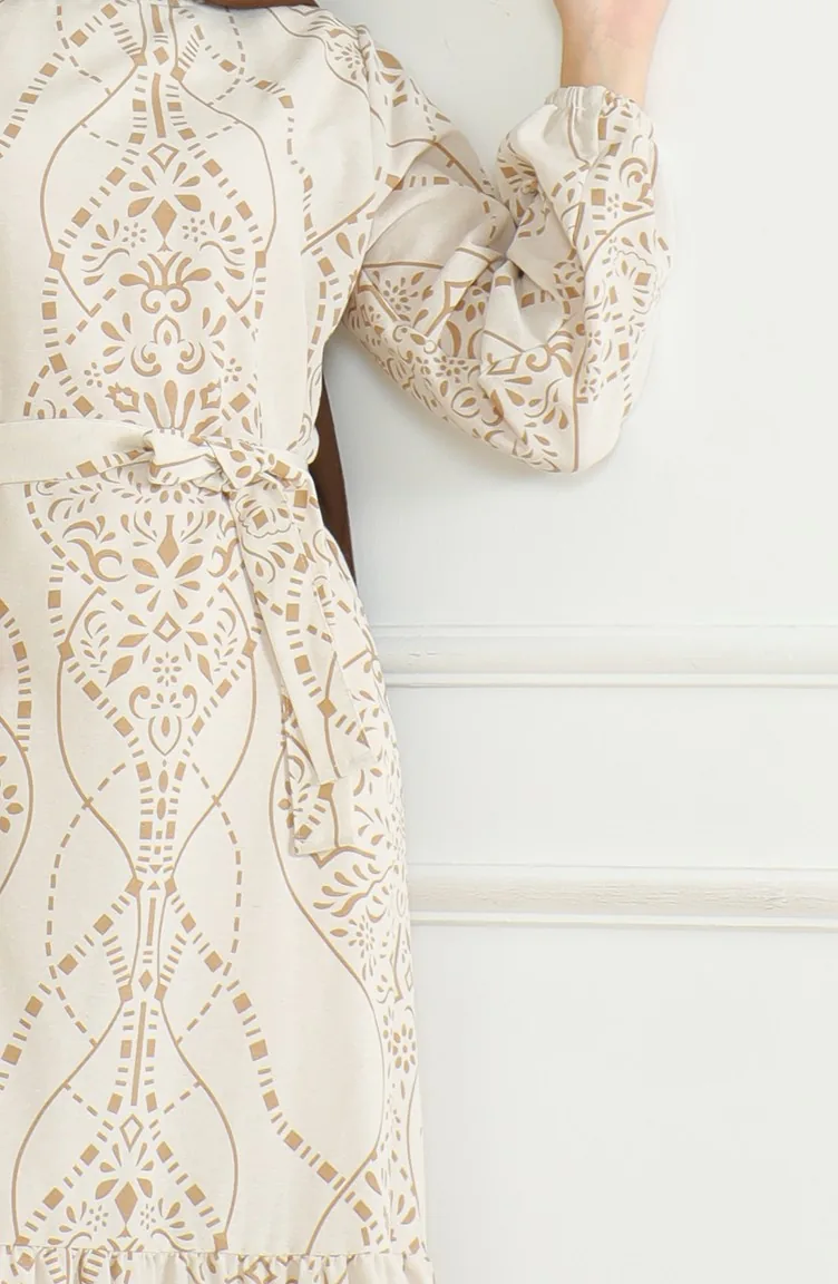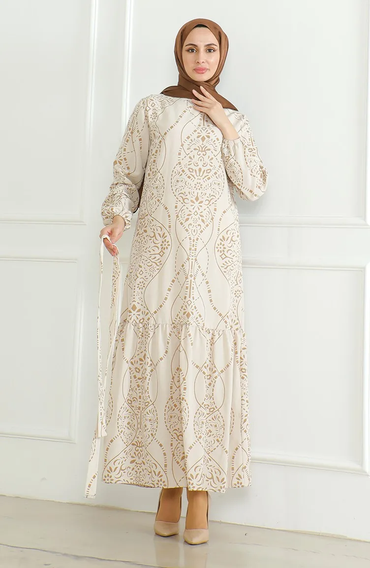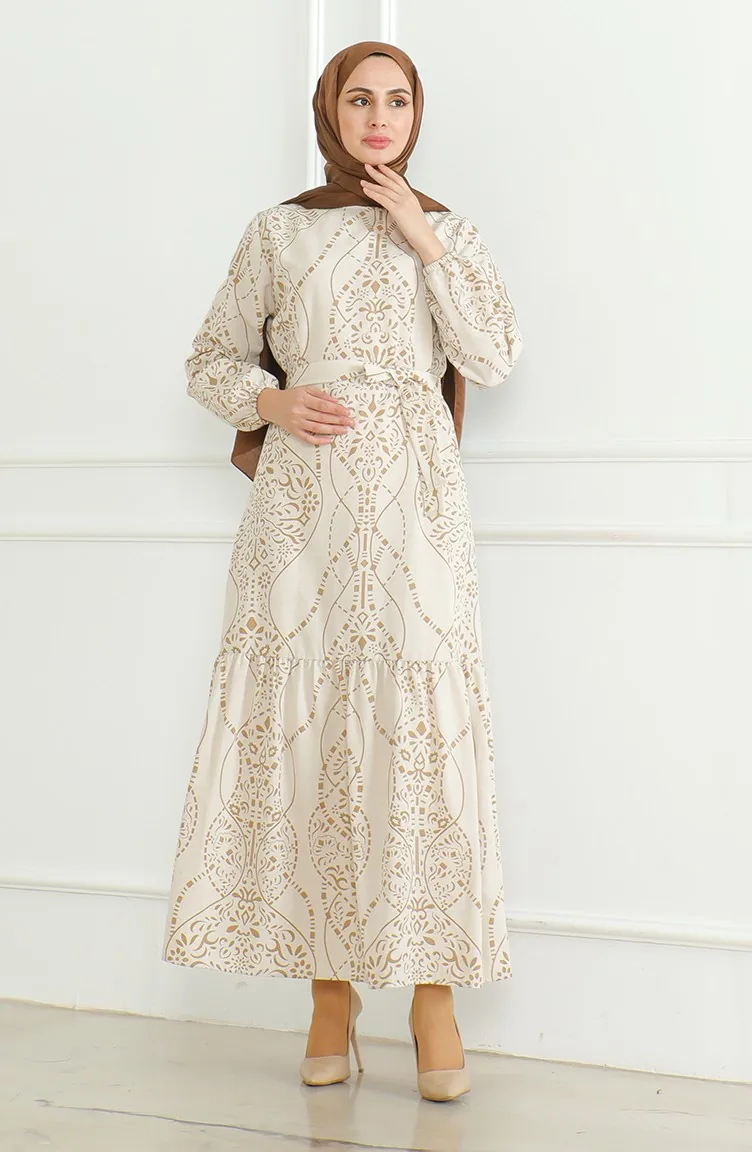 Patterned Belted Linen Dress 0471e-02 Beige Milk Coffee 0471E-02