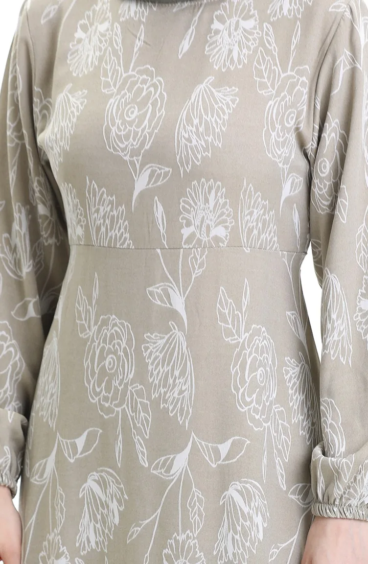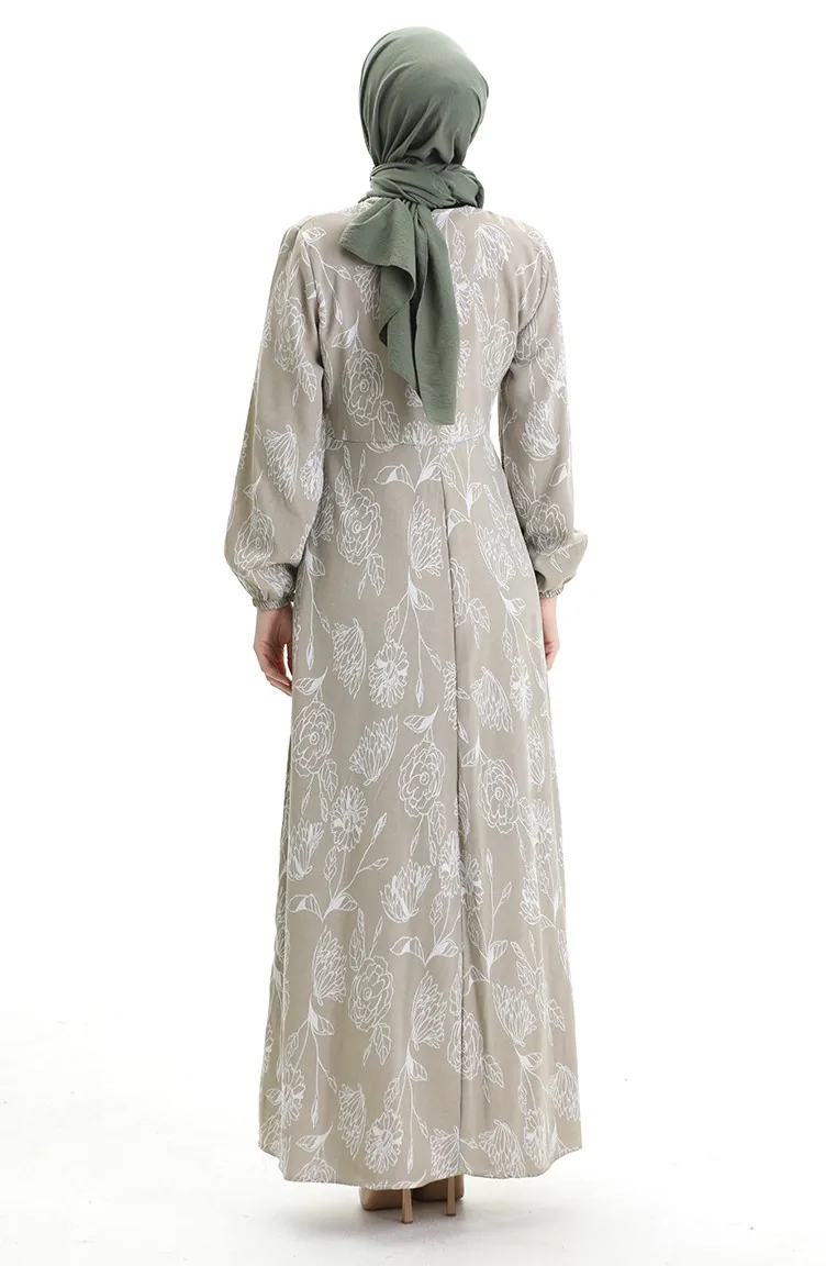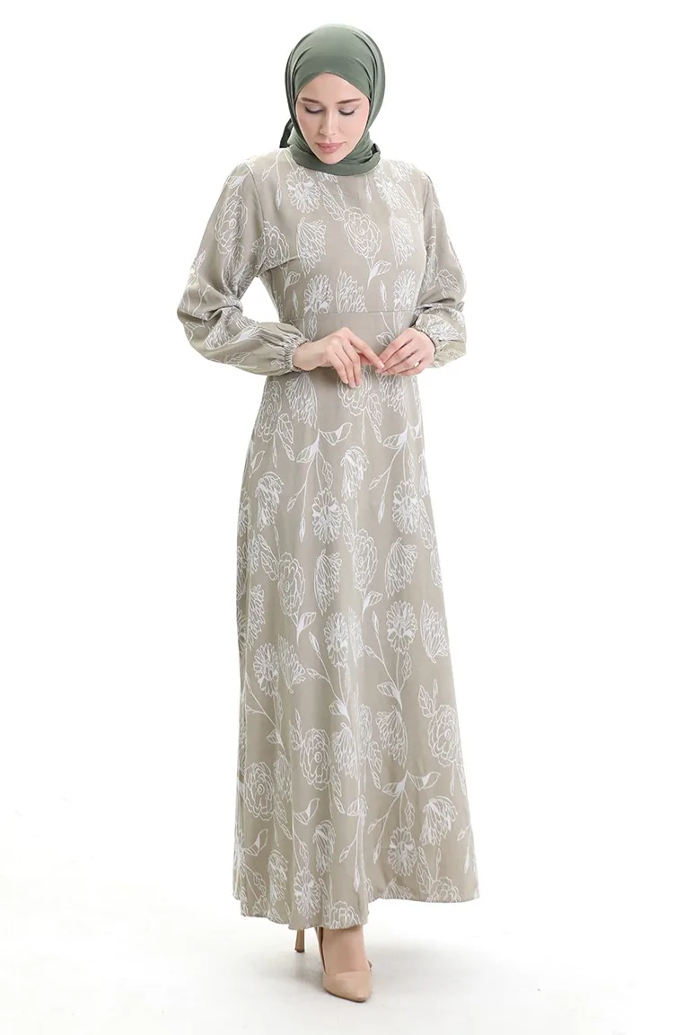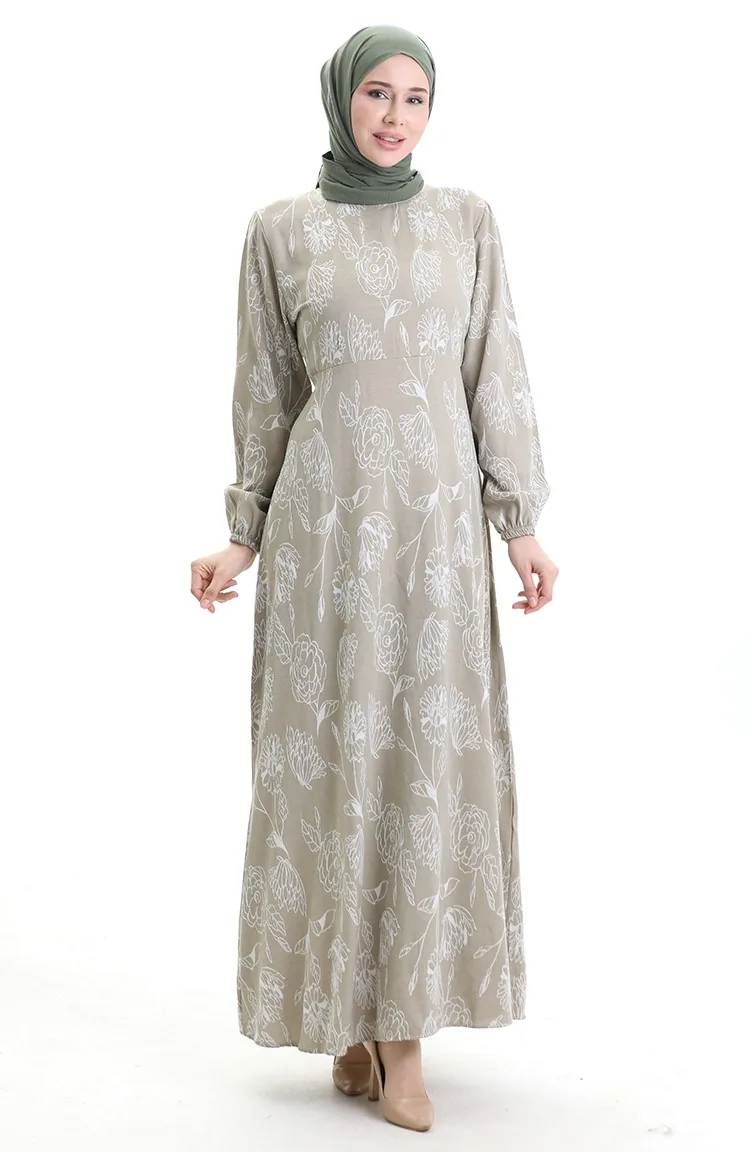 Patterned Dress With Elastic Sleeves 2046-04 Dark Beige 2046-04
