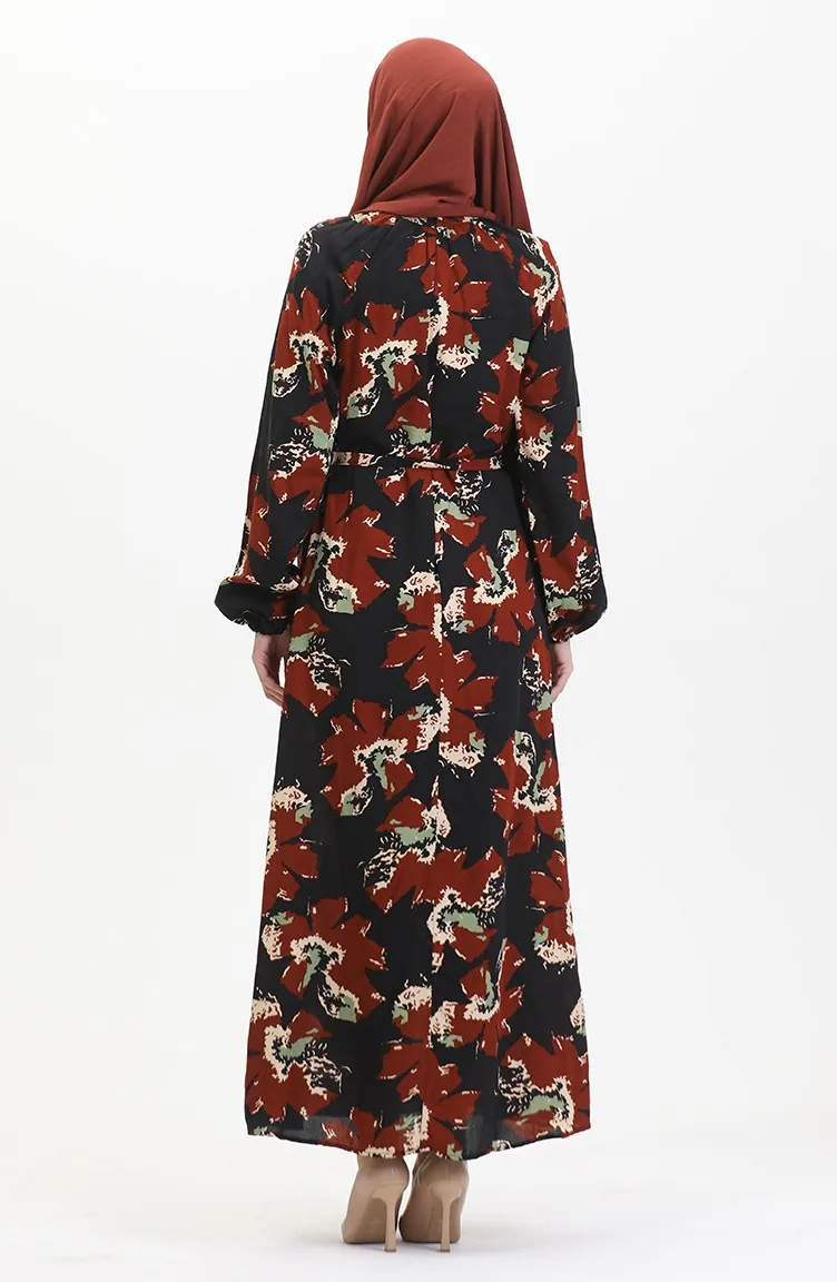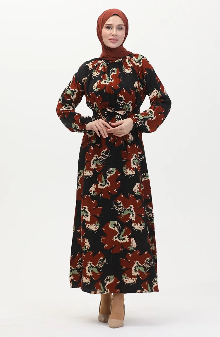 Raglan Sleeve Patterned Belted Dress 0476-01 Brick 0476-01