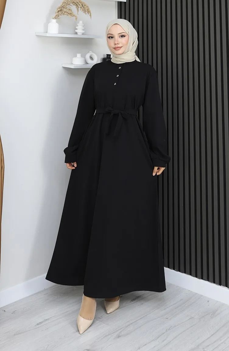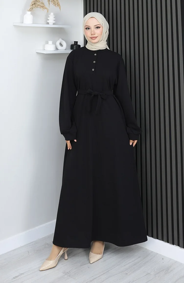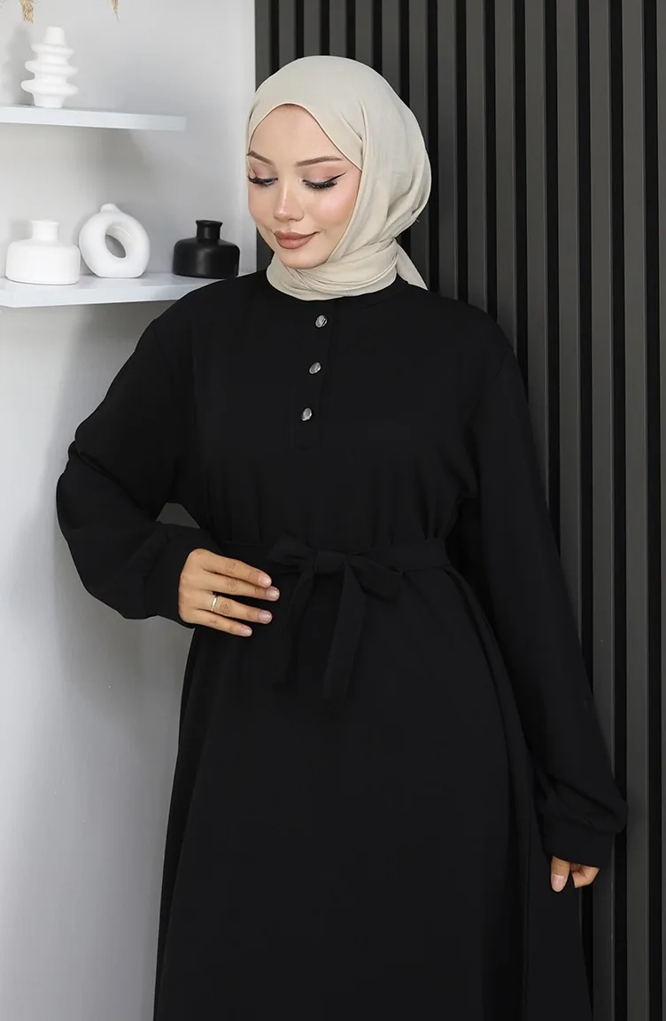 Scuba Fabric Half Button Belted Dress 2167-05 Black 2167-05