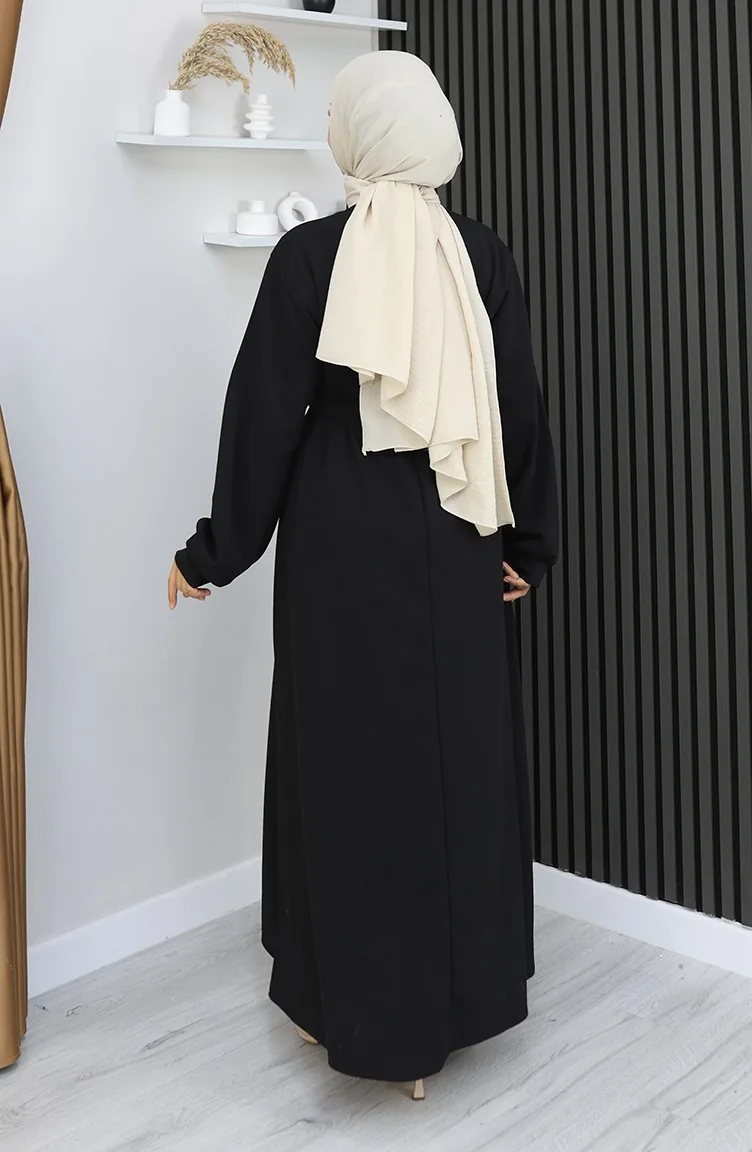 Black color is used. scuba crepe scuba crepe fabric. It has a plain appearance. Buttons have been used to make it easy to use. Tippet collar is prefered. Suitable for 4 seasons. Plus size option available.