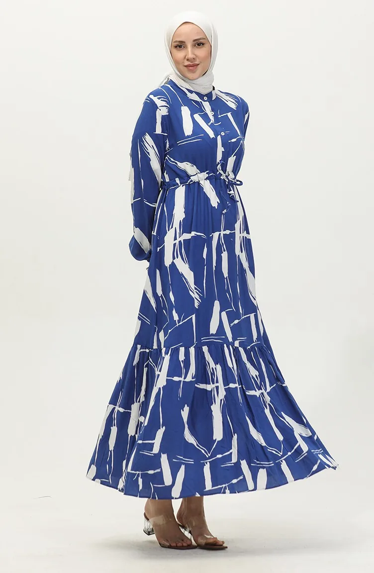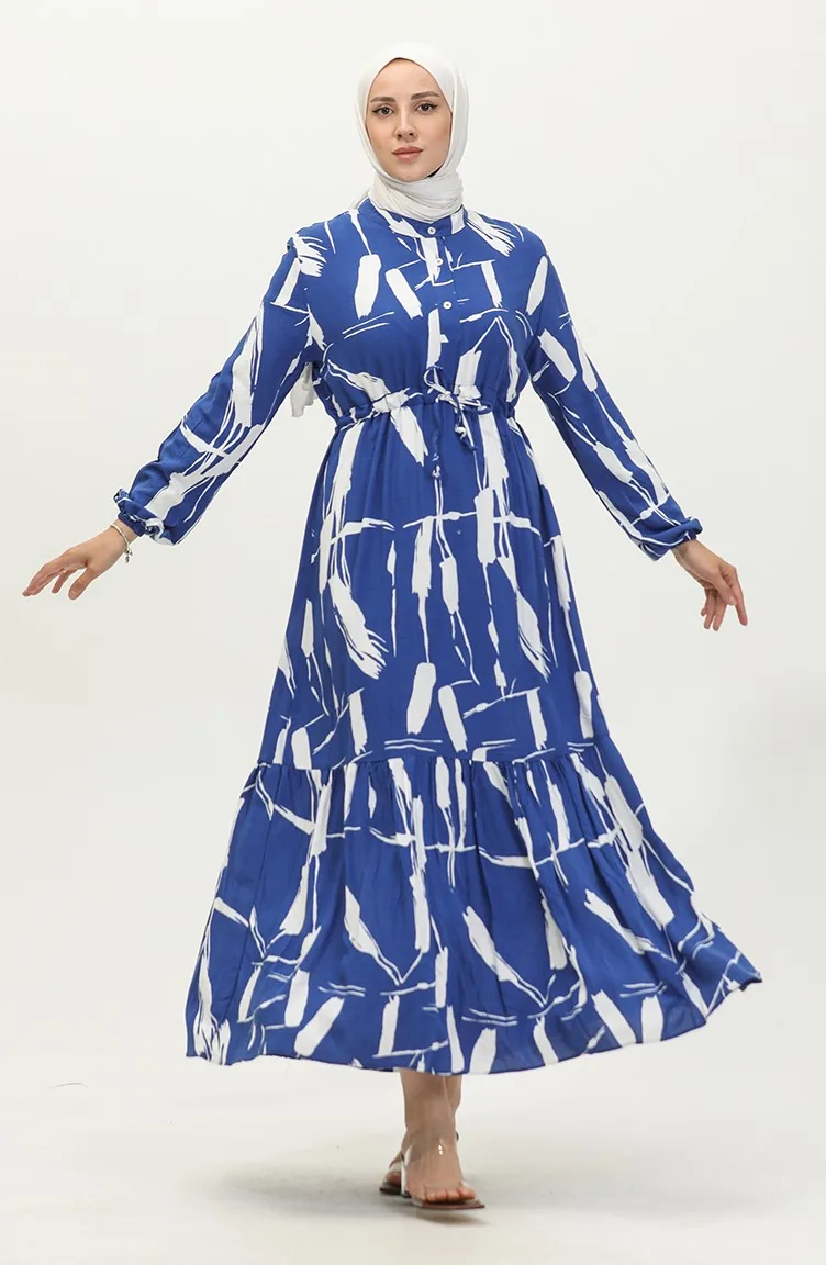 Saxon blue color is used. Viscose is a type of synthetic fabric and is convenient to use. Designed with patterned fabric. The product is used unlined. It's made of elastic sleeves. Tippet collar is prefered. Suitable for 4 seasons. Plus size option available.