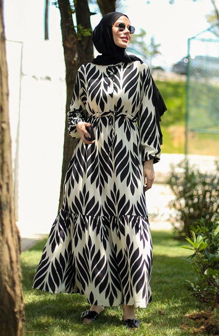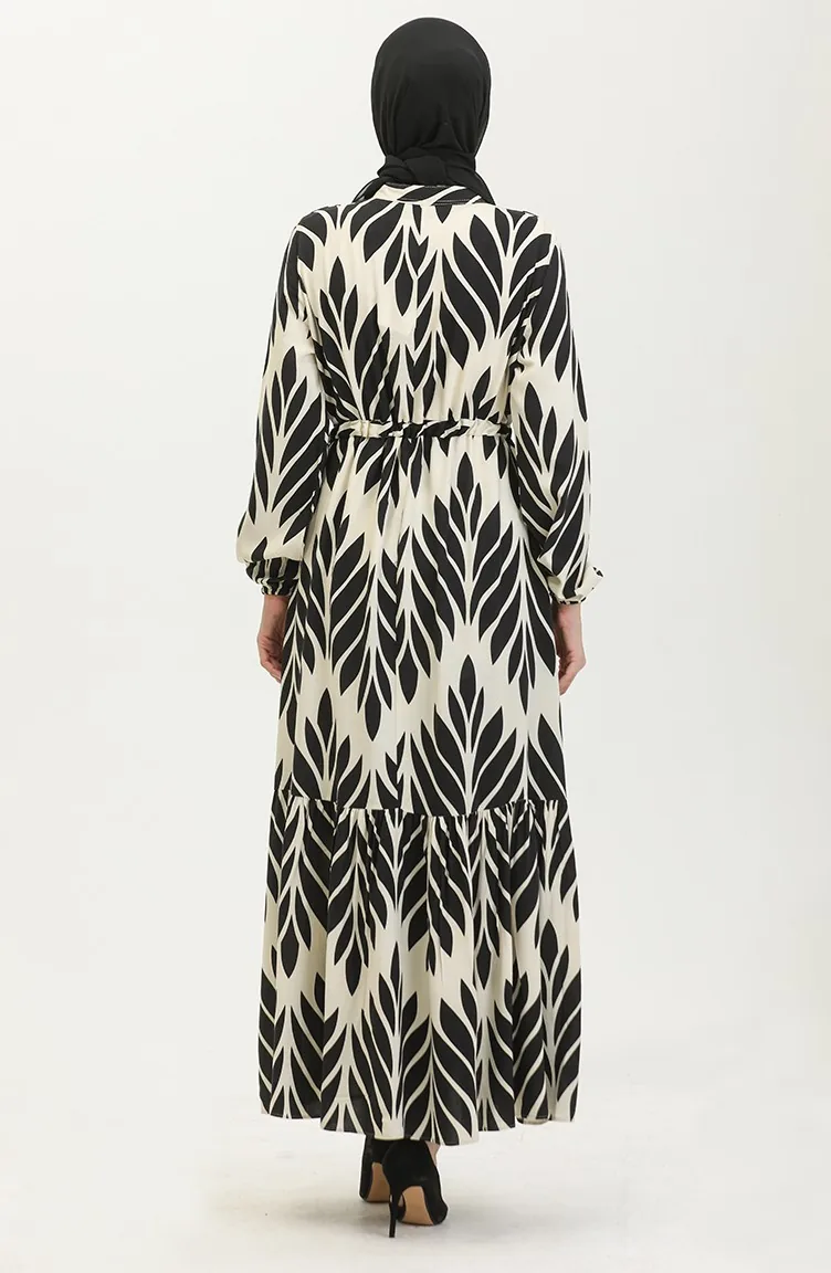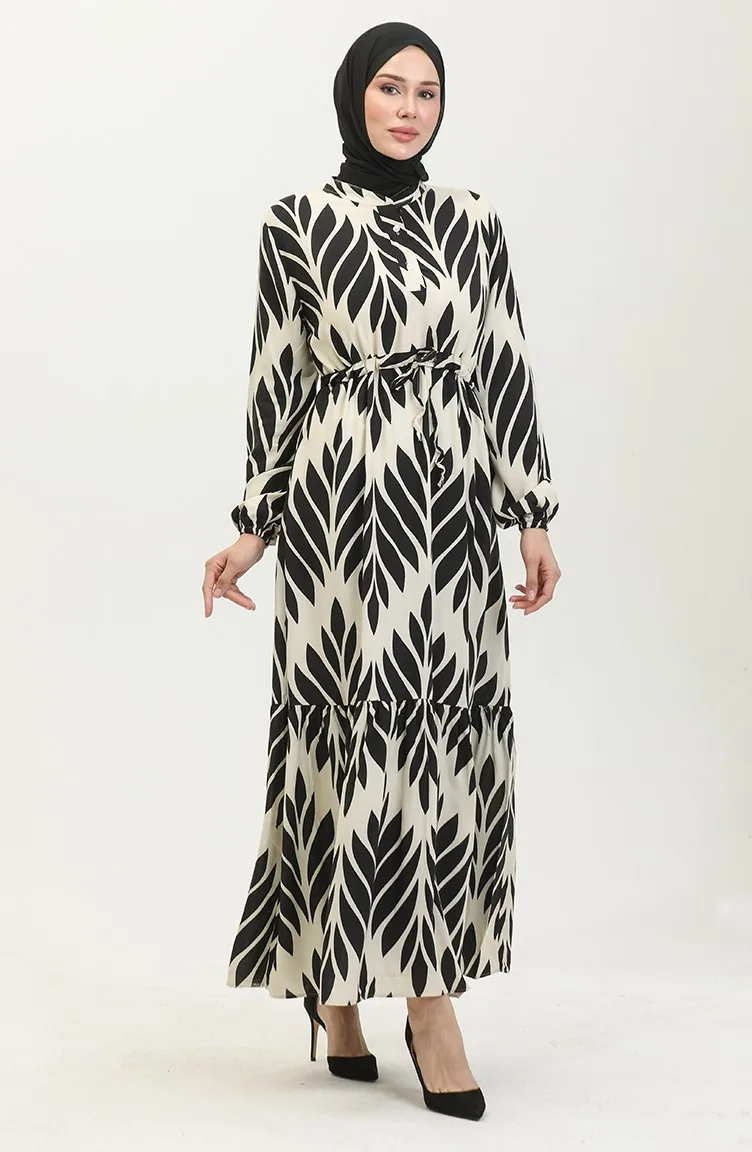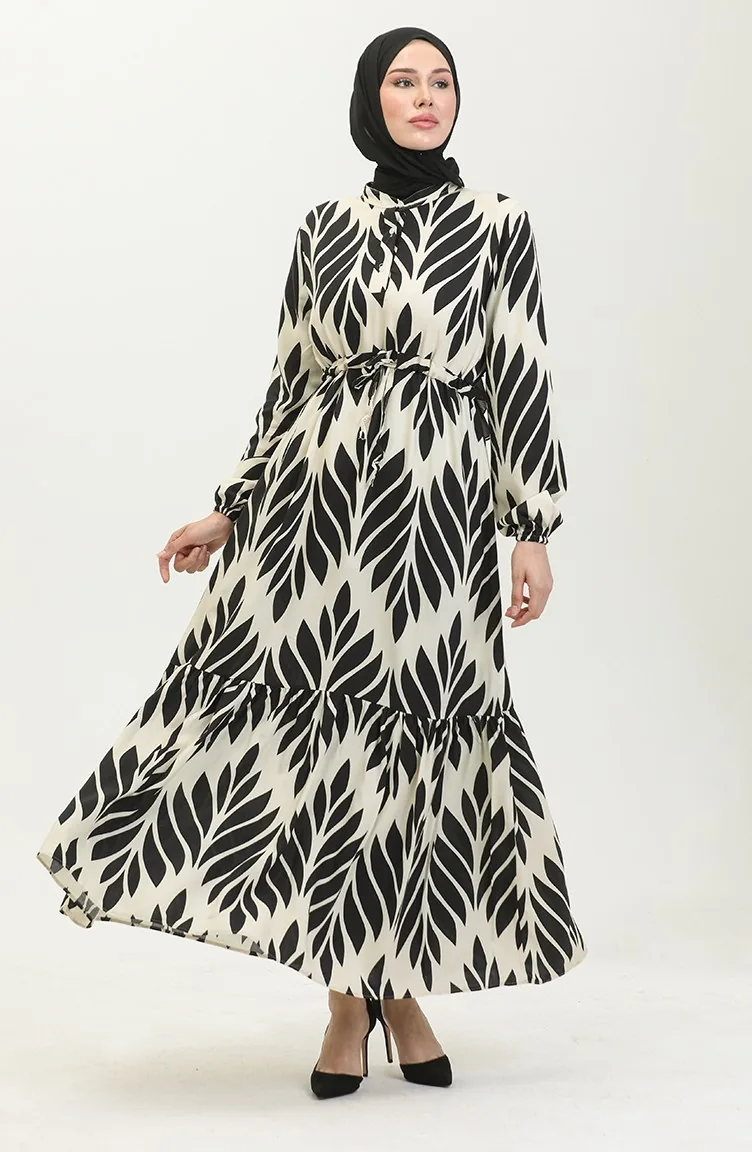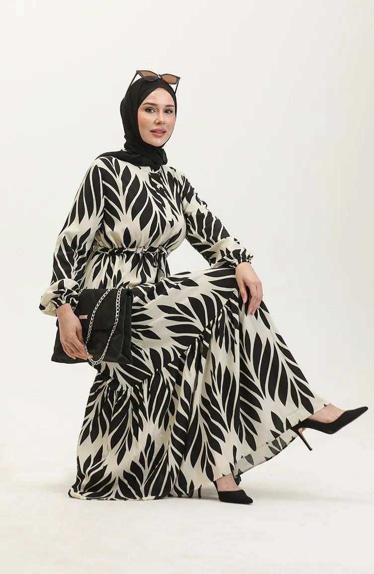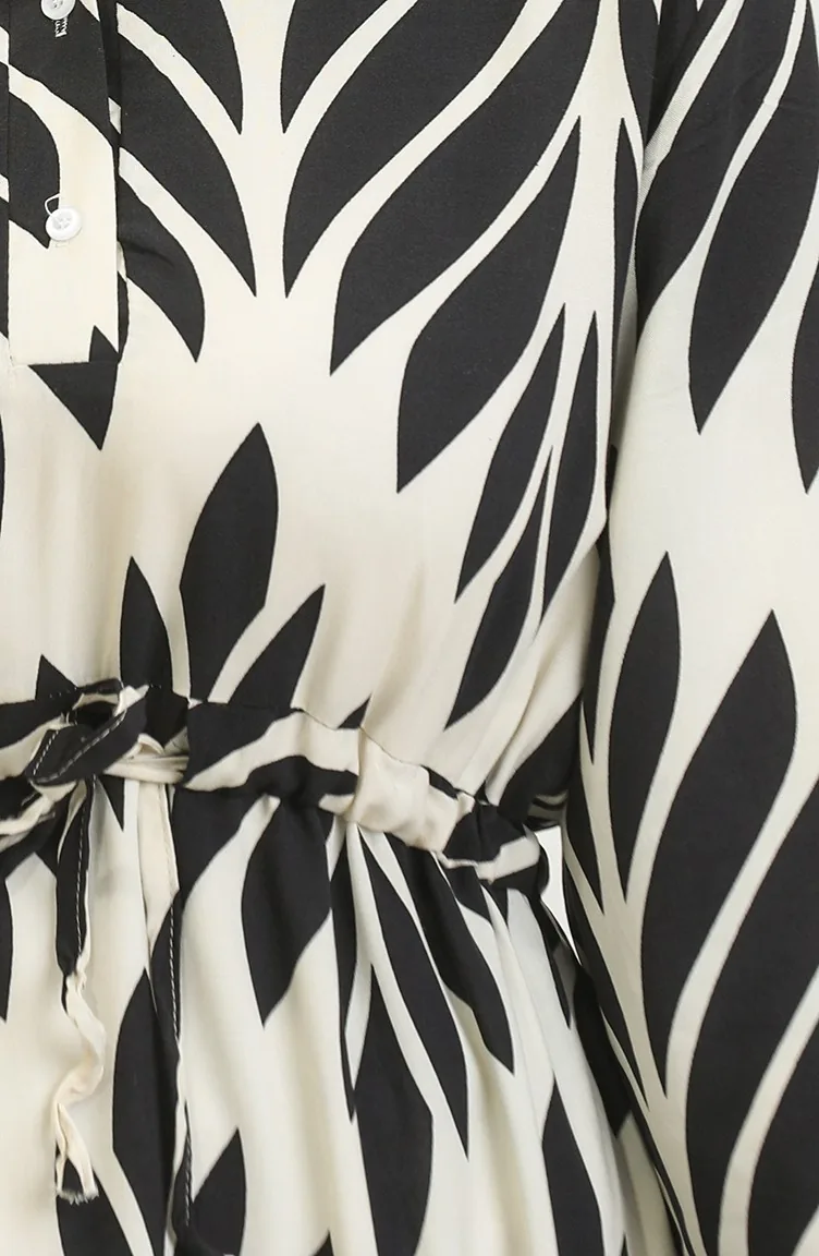 Viscose Brush Pattern Gathered Dress 81869-07 Cream Black 81869-07