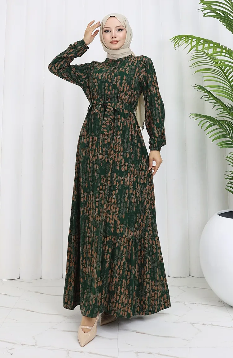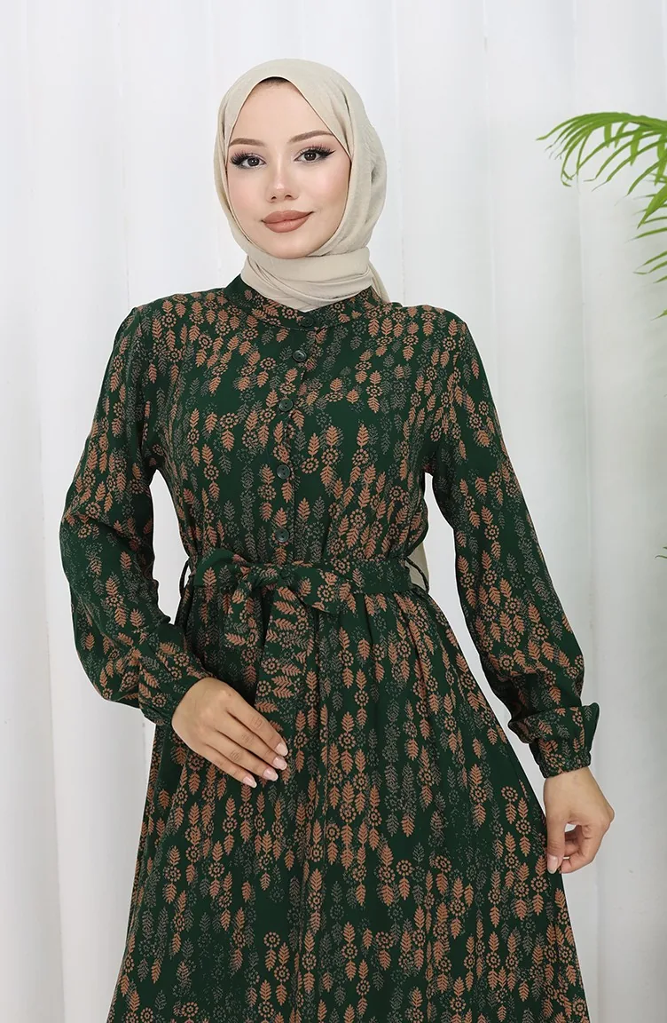 Viscose Fabric Buttoned Belted Dress 4075-01 Emerald Green 4075-01