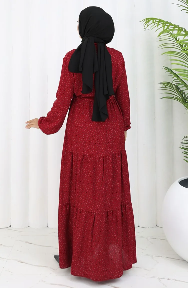 Viscose Fabric Half Buttoned Patterned Dress 0068-03 Claret Red 0068-03