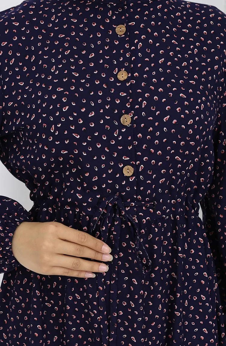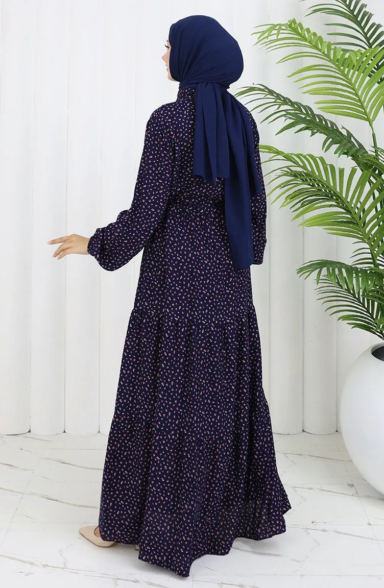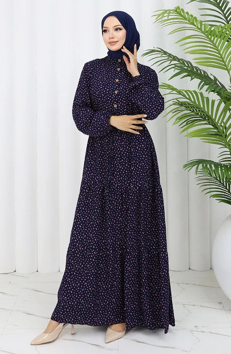 Viscose Fabric Half Buttoned Patterned Dress 0068-05 Navy Blue 0068-05
