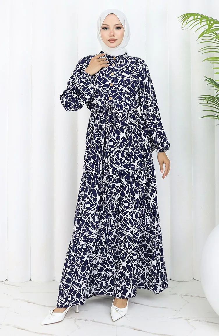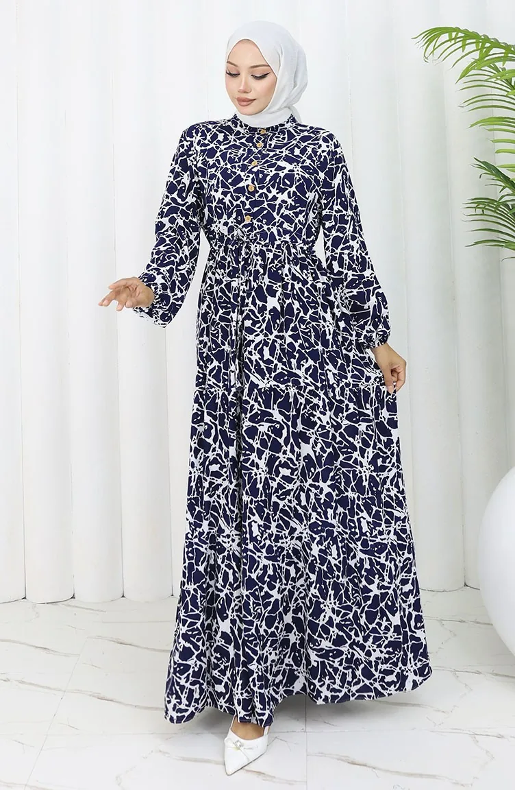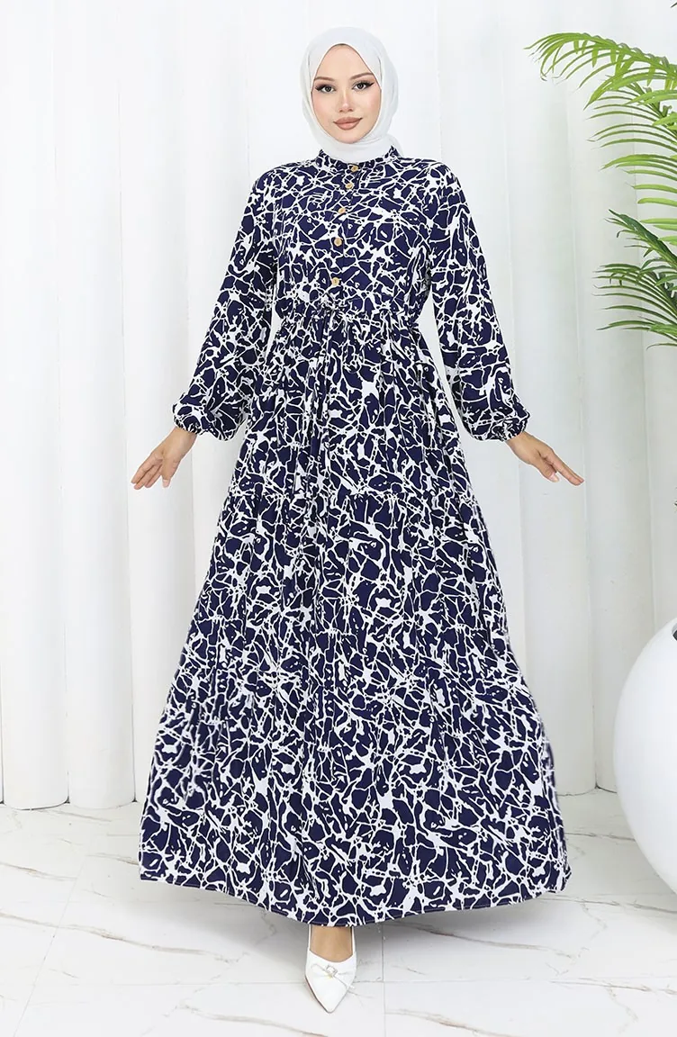 Viscose Fabric Half Buttoned Patterned Dress 0087-02 Navy Blue White 0087-02