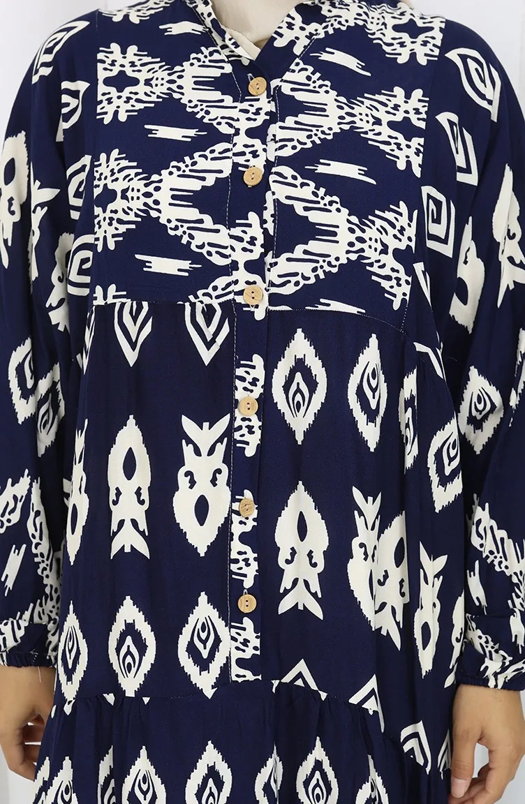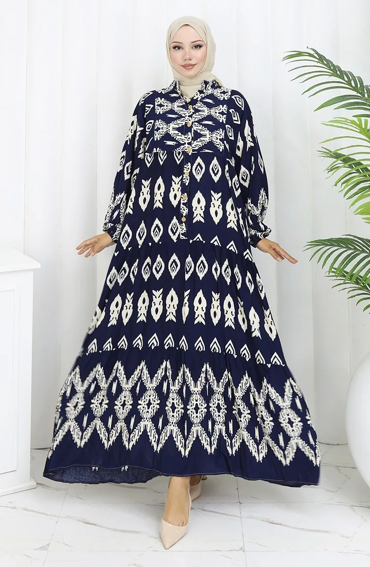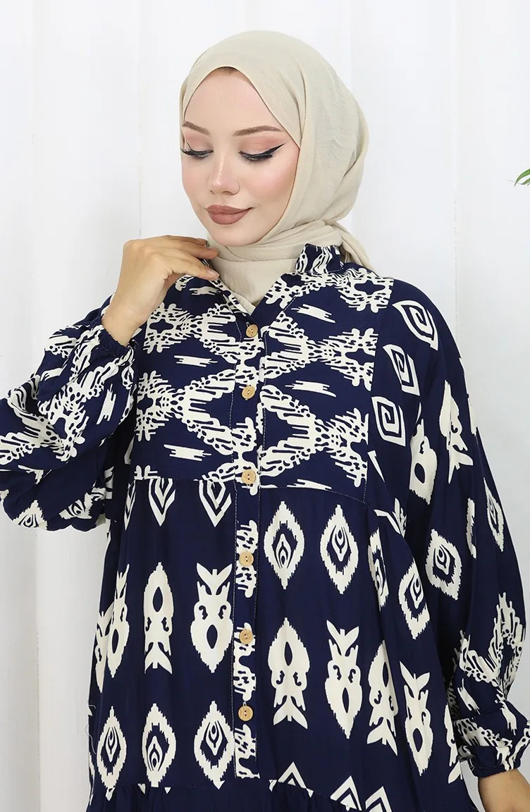 Viscose Fabric Half Buttoned Patterned Dress 0107-03 Navy Blue 0107-03