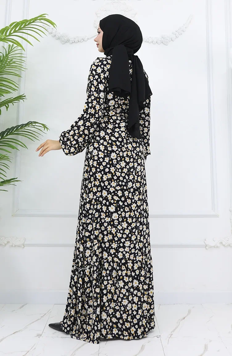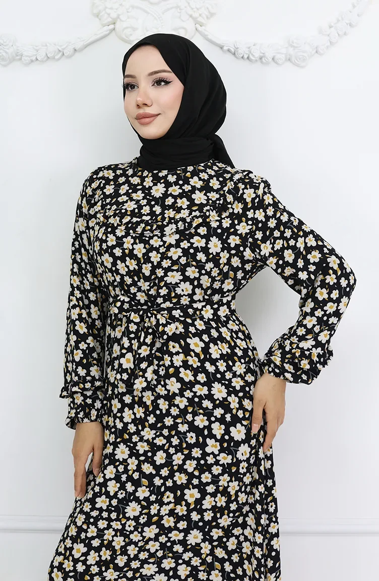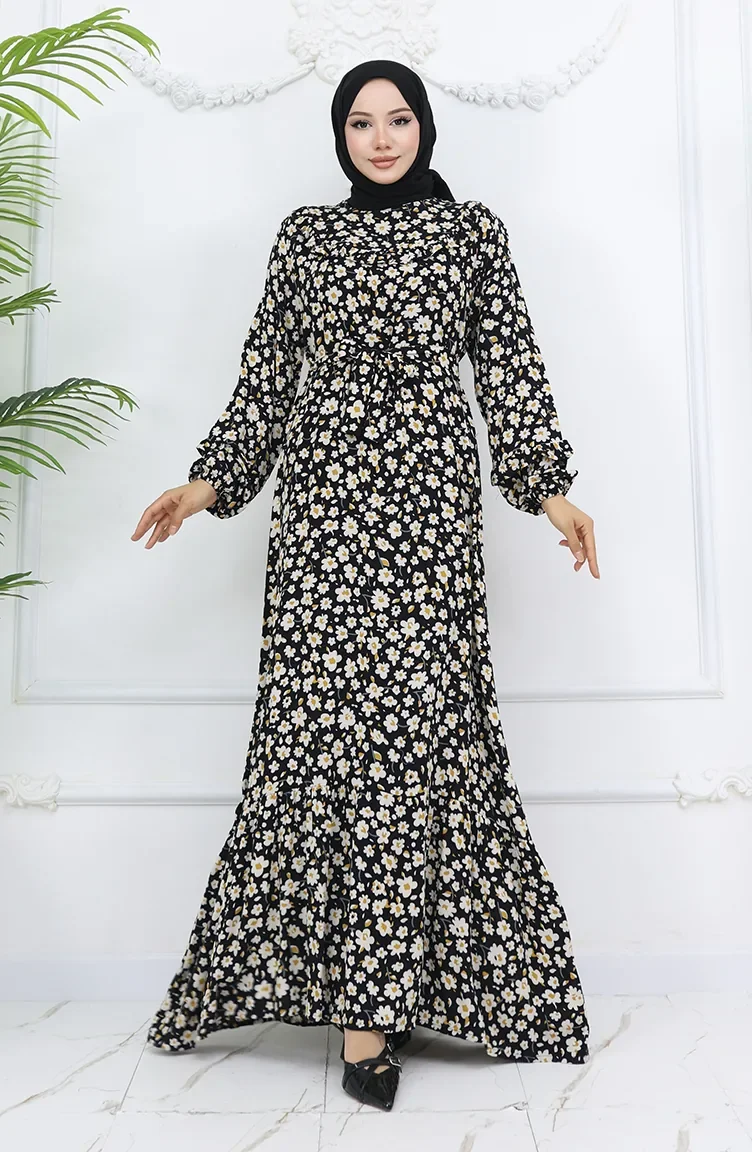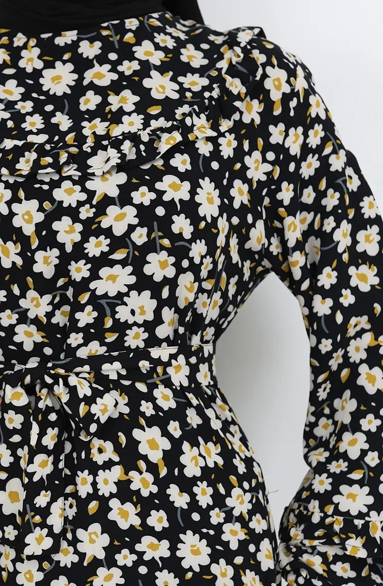 Black color is used. Viscose is a type of synthetic fabric and is convenient to use. Designed with patterned fabric. It has ruffle detail. It's made of elastic sleeves. The Zero collar is preferred for all types of clothing. Suitable for 4 seasons. Rahat. Plus size option available.