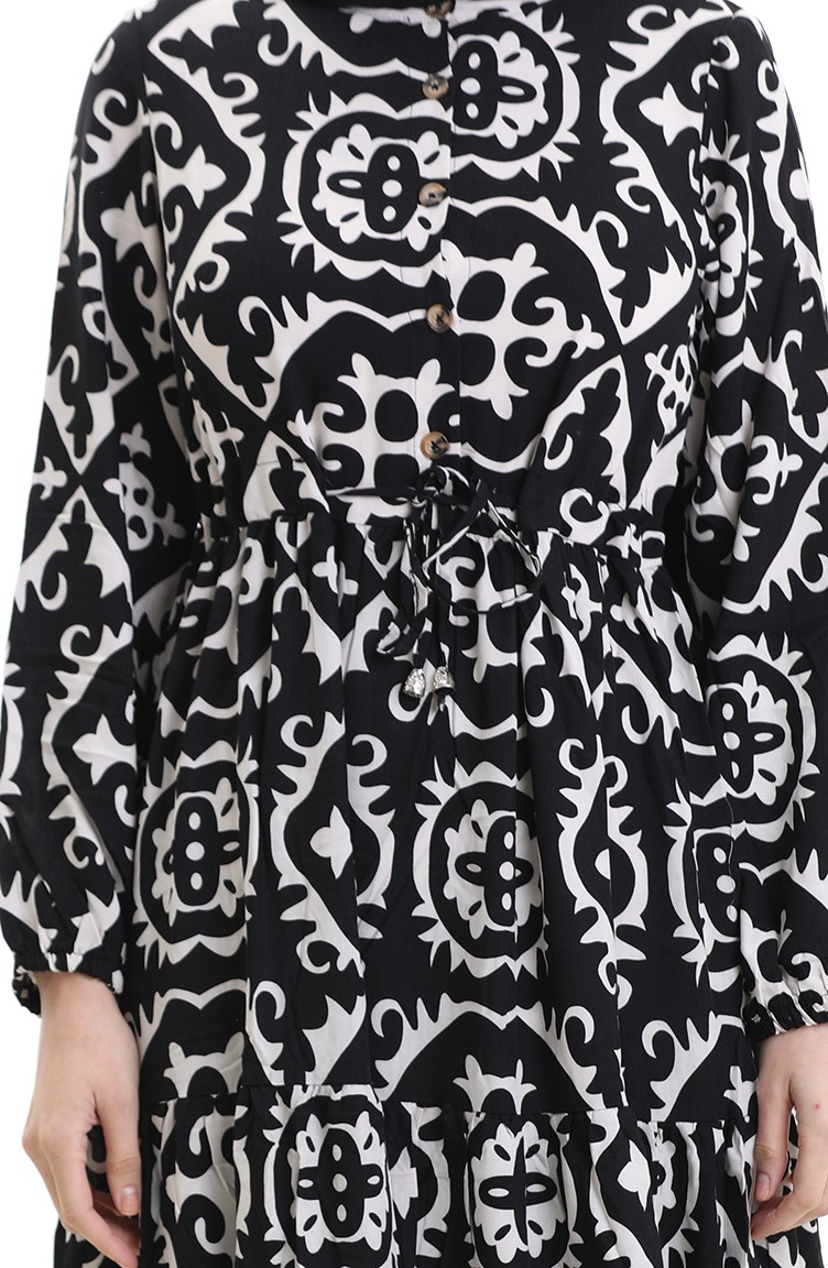 Black color is used. Viscose is a type of synthetic fabric and is convenient to use. Designed with patterned fabric. Buttons have been used to make it easy to use. Tippet collar is prefered. Suitable for 4 seasons. Plus size option available.