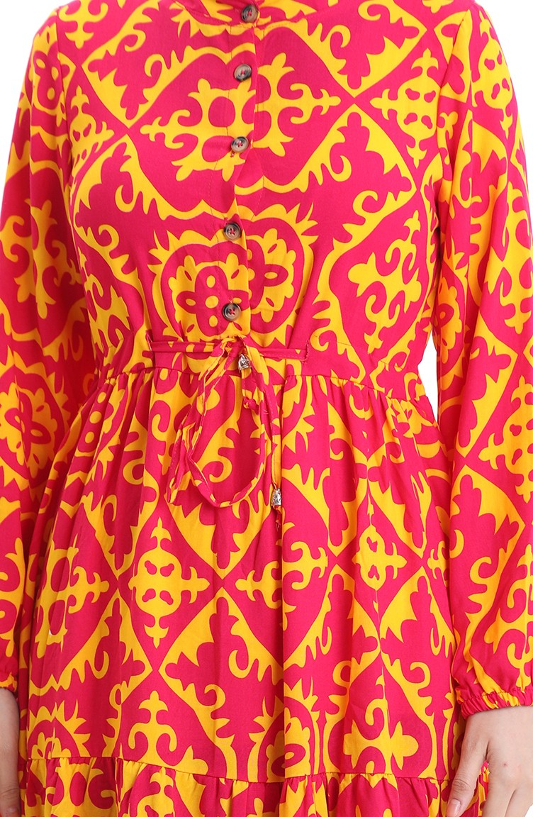 Fuchsia color is used. Viscose is a type of synthetic fabric and is convenient to use. Designed with patterned fabric. Buttons have been used to make it easy to use. Tippet collar is prefered. Suitable for 4 seasons. Plus size option available.