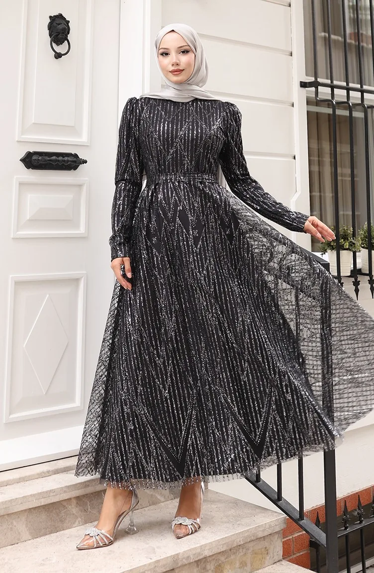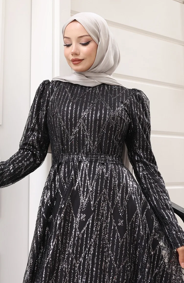 Glitter-Plated Belted Evening Dress 5613-03 Black 5613-03