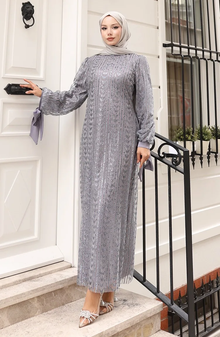 Leaf Patterned Glittery Coated Evening Dress 5612-02 Gray 5612-02