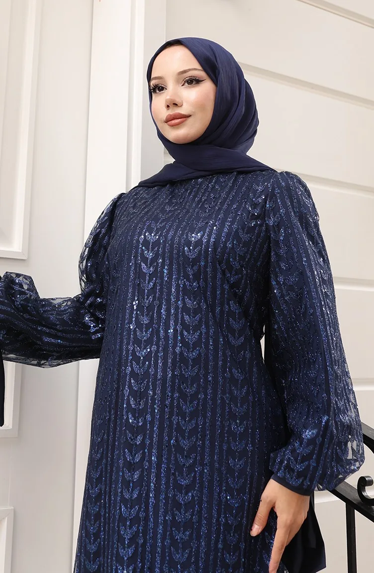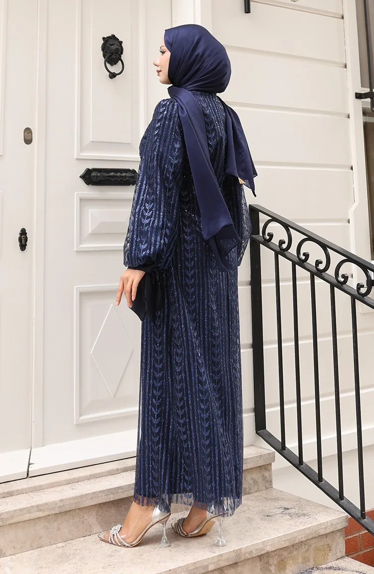 Leaf Patterned Glittery Coated Evening Dress 5612-03 Navy Blue 5612-03