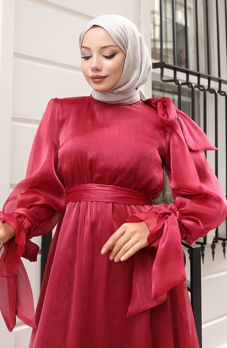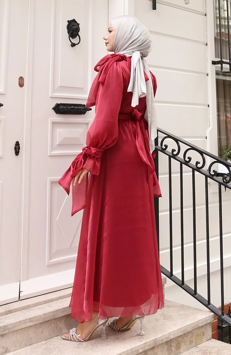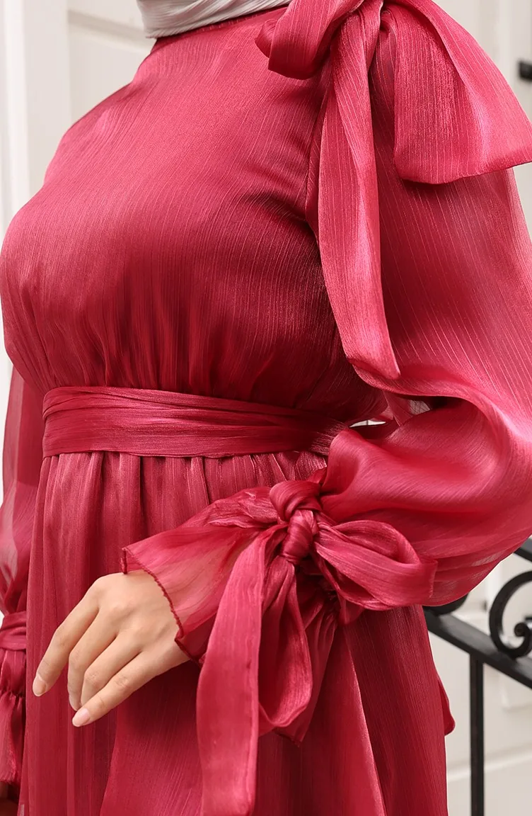 Organza Tulle Waist Pleated Belted Evening Dress 5611-09 Burgundy 5611-09