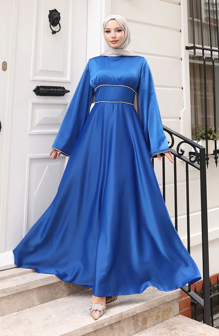 Satin Piping Gathered Evening Dress 5610-05 Indigo 5610-05