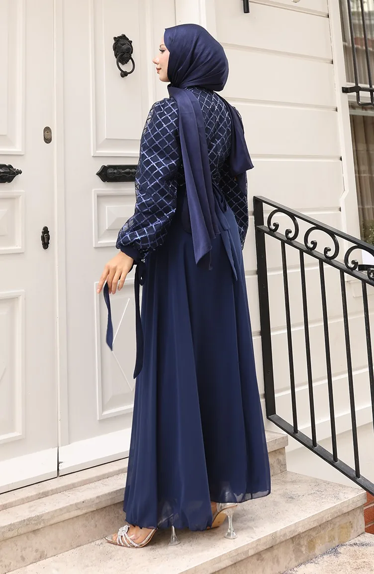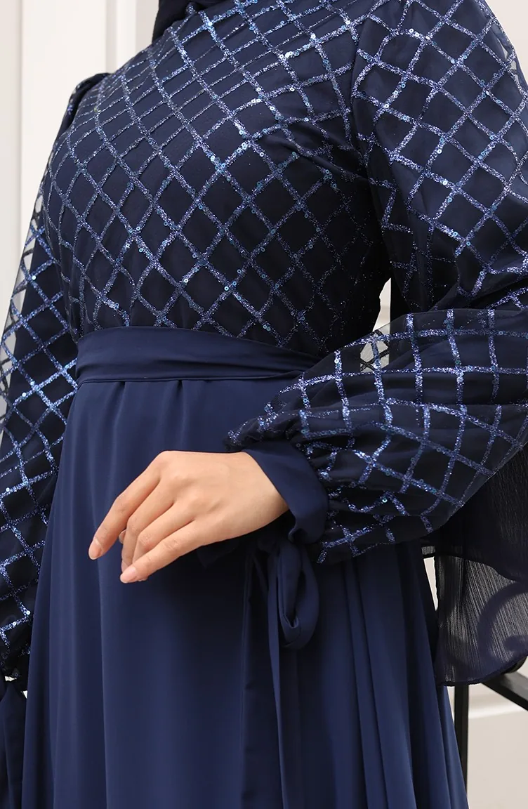 Sequined Belted Chiffon Evening Dress 5617-02 Navy Blue 5617-02