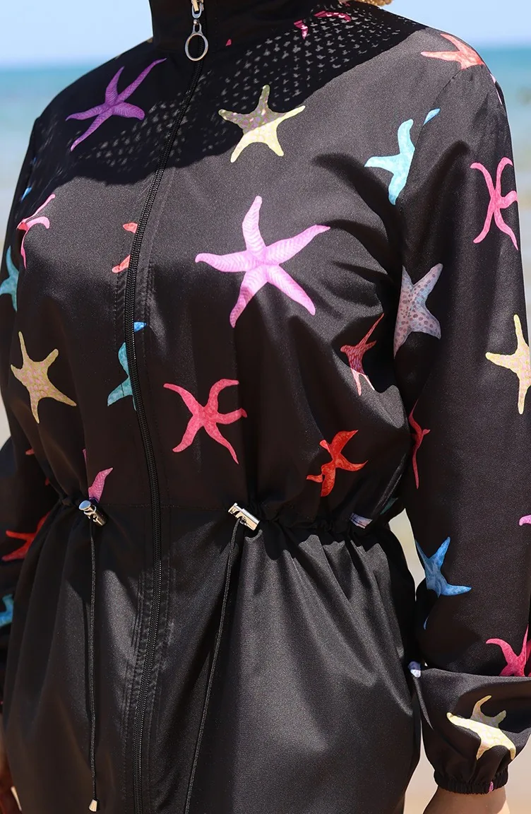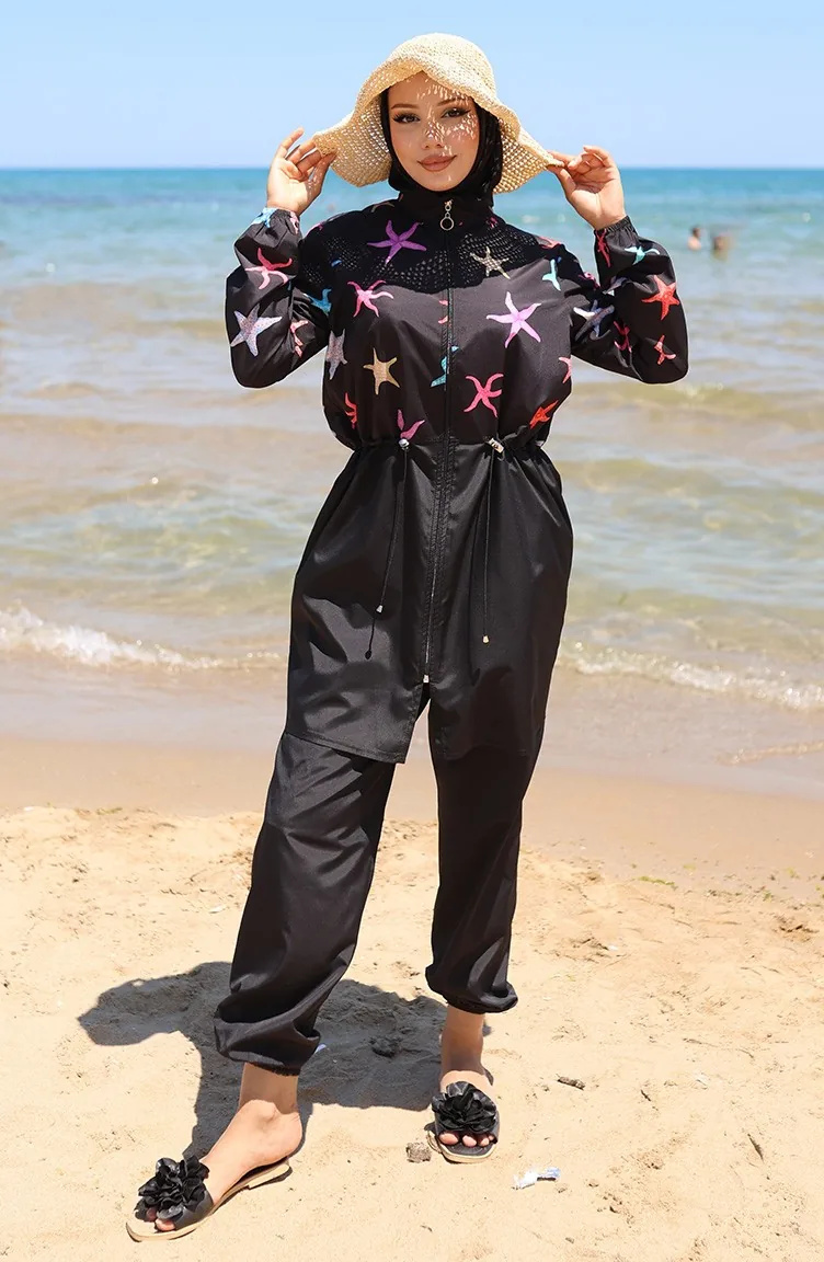 Elastic Waist Star Patterned Zippered Hijab Swimsuit With Bonnet Gift 9005B-01 Black Lilac 9005B-01