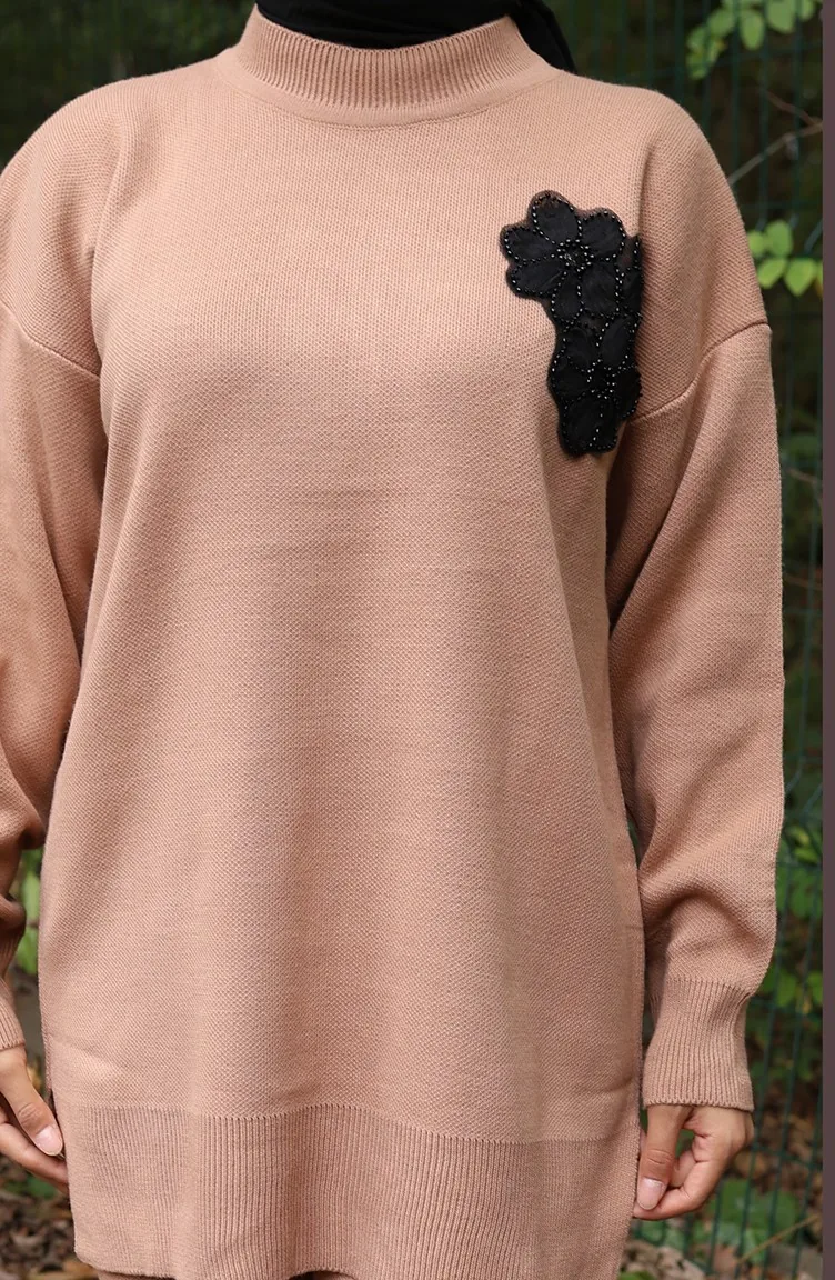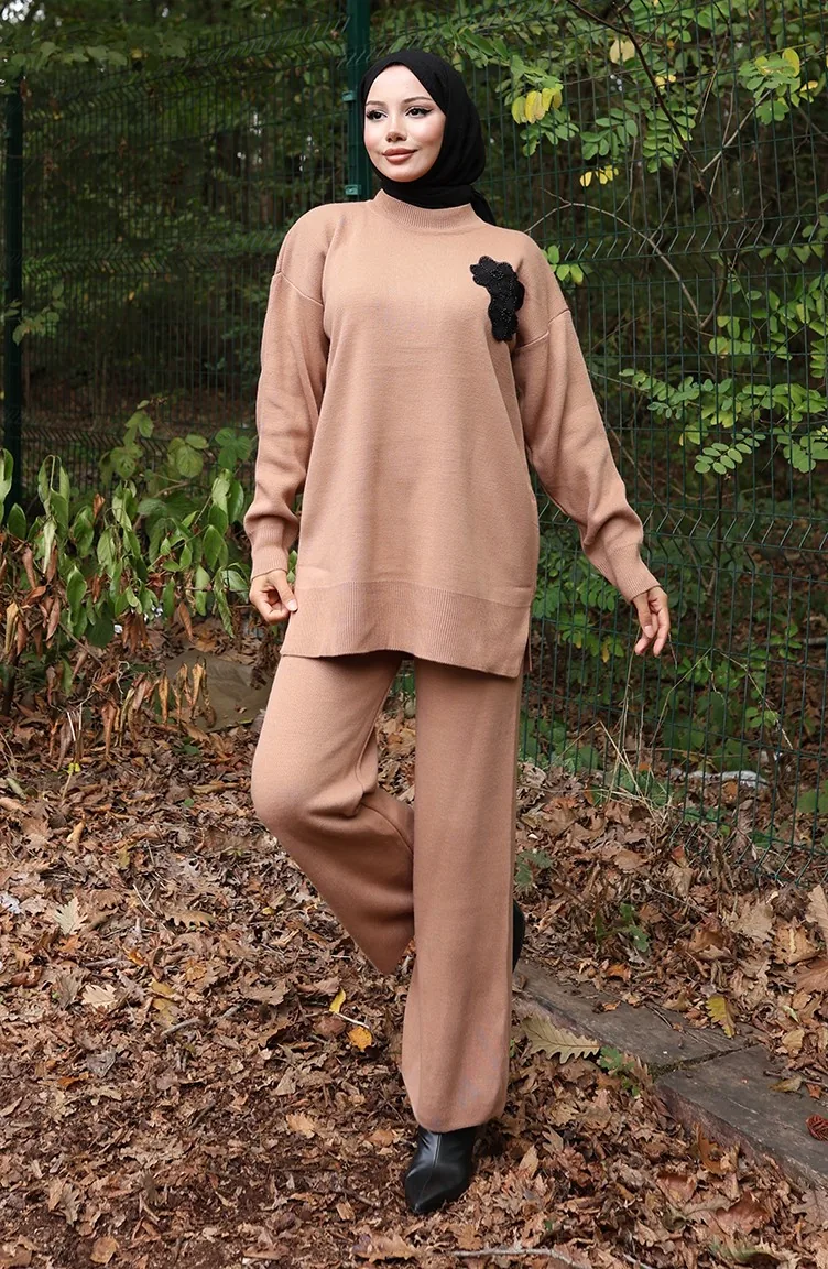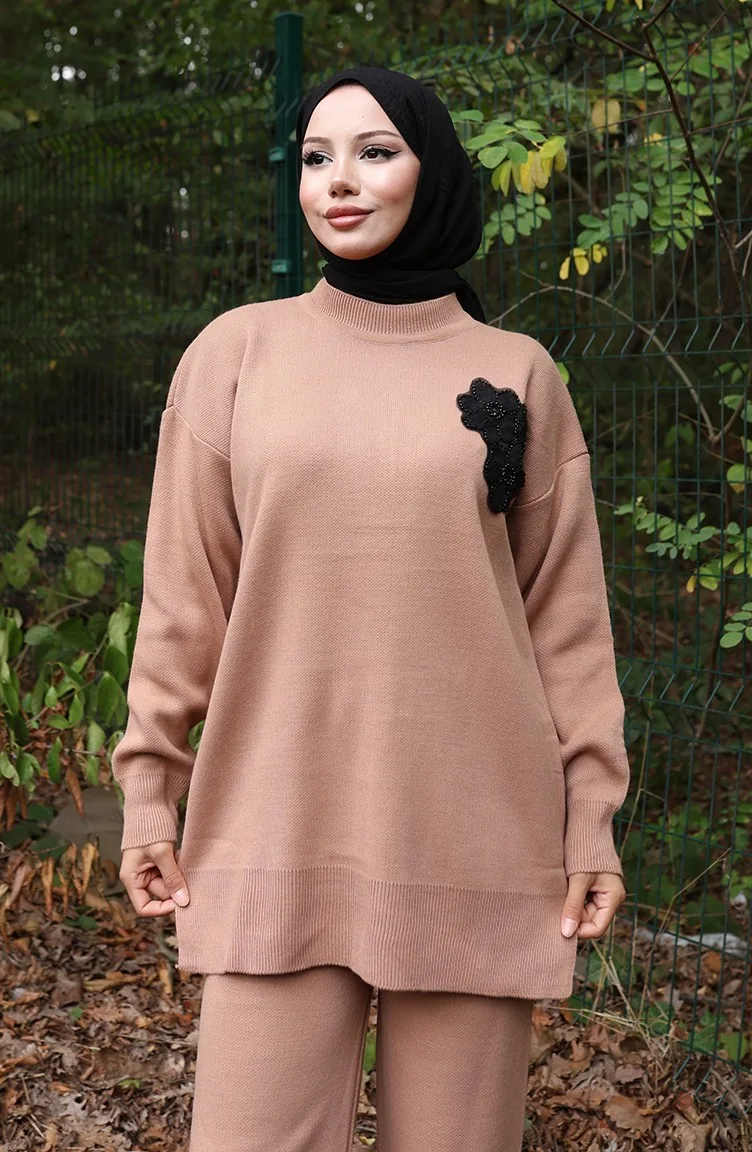 Knitwear Beaded Embroidered Tunic Trousers Two Piece Suit 1021-02 Milk Coffee 1021-02