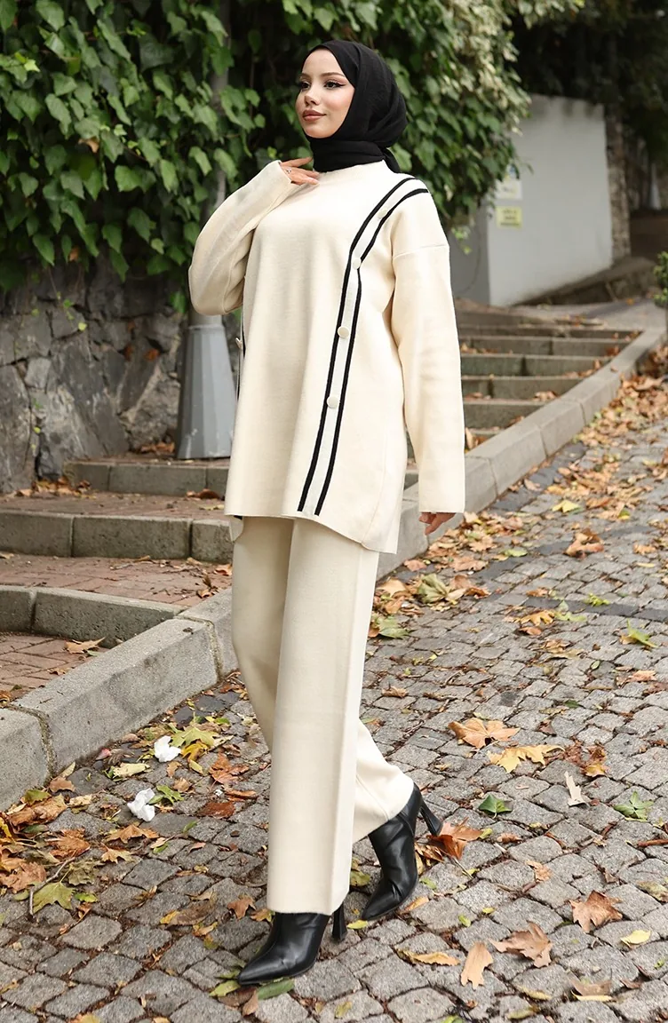 Knitwear Buttoned Tunic Trousers Two Piece Suit 1128-04 Beige 1128-04