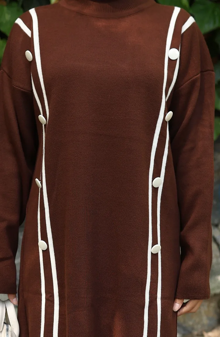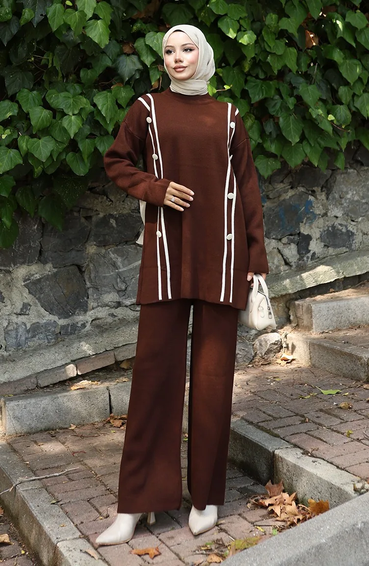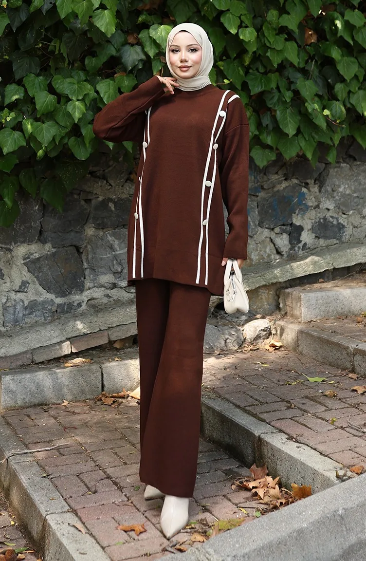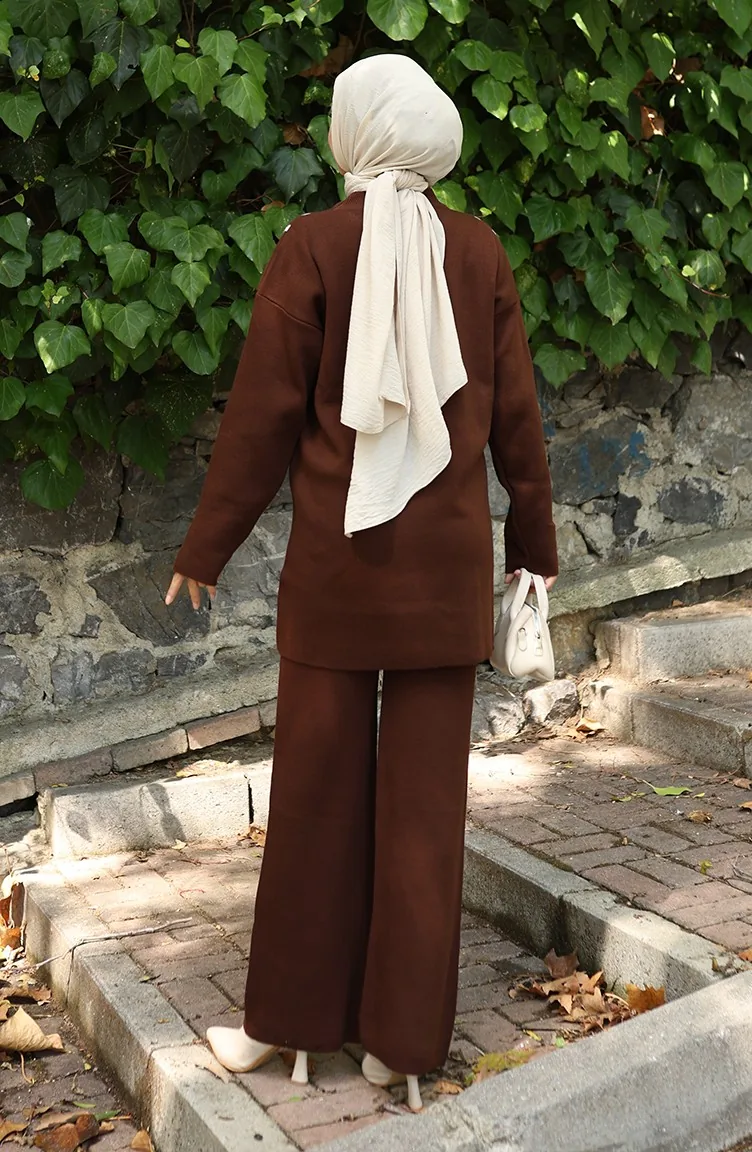 Knitwear Buttoned Tunic Trousers Two Piece Suit 1128-07 Brown 1128-07