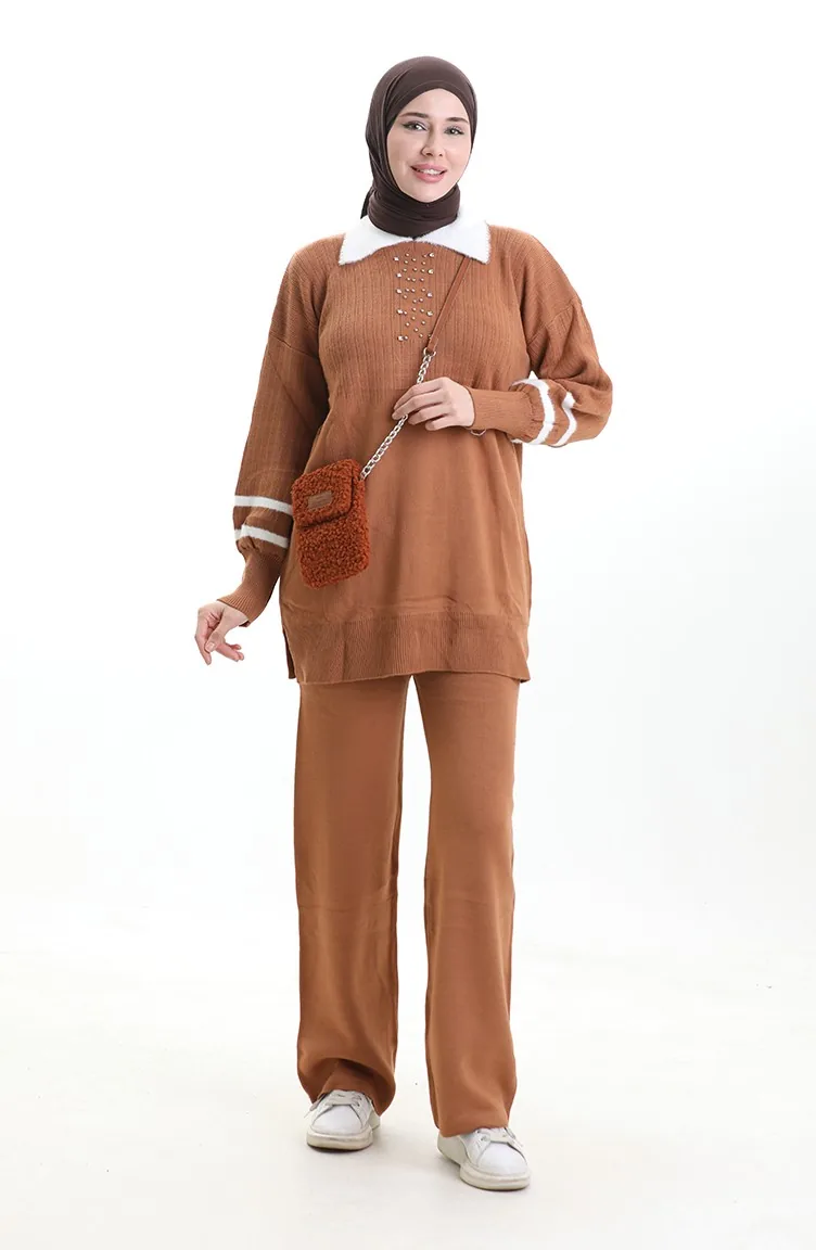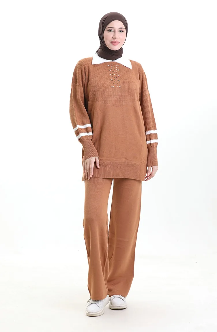 Knitwear Collar Detailed Tunic Trousers Two Piece Set 1002-11 Tan 1002-11