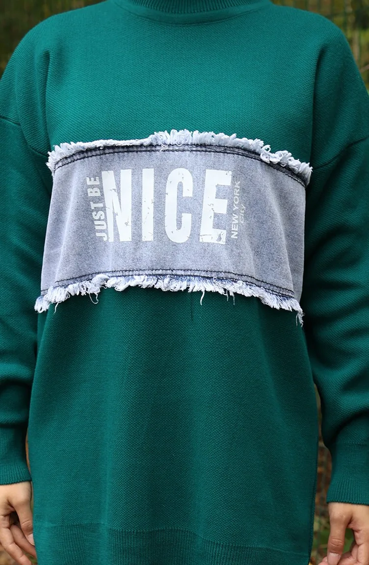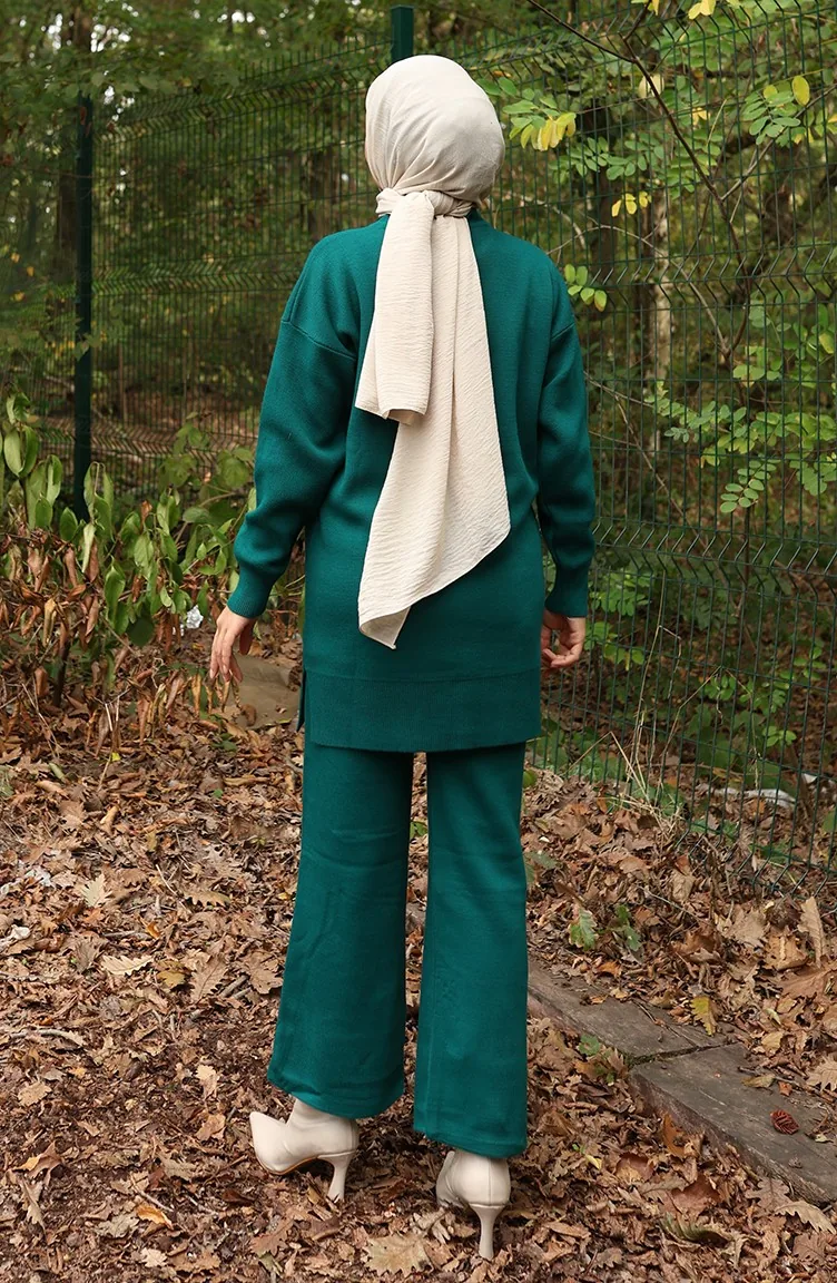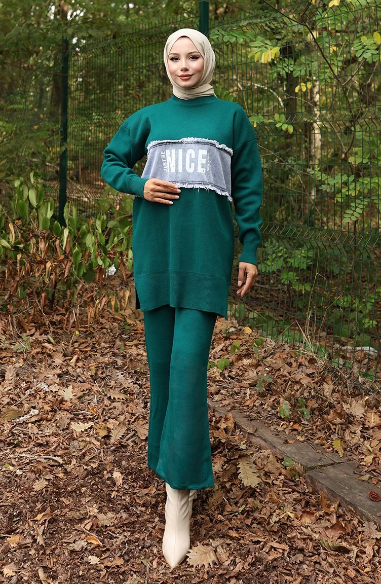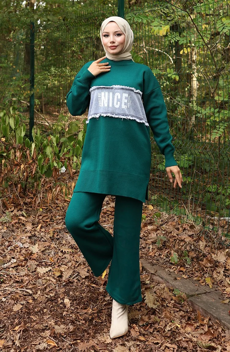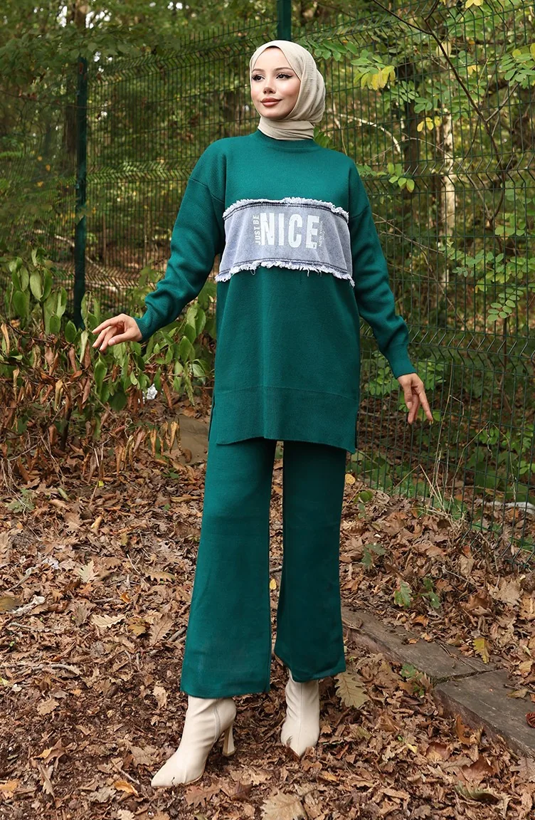 Knitwear Denim Garnished Tunic Trousers Two Piece Set 1094-01 Petrol 1094-01