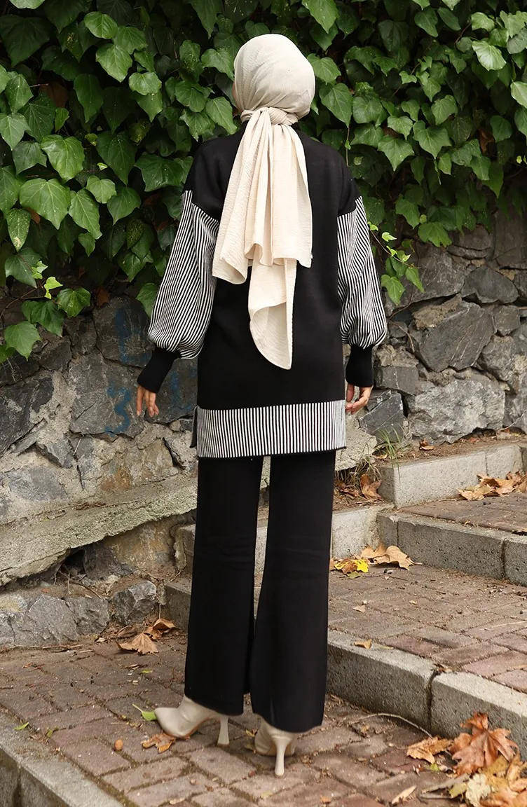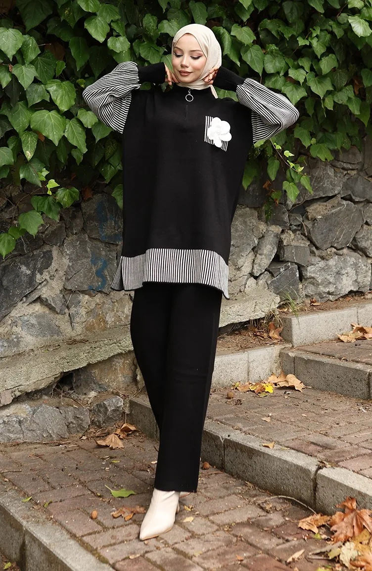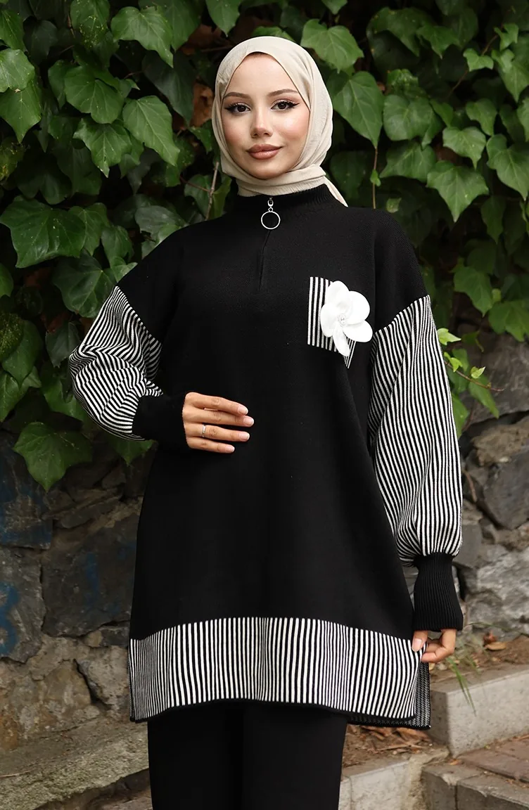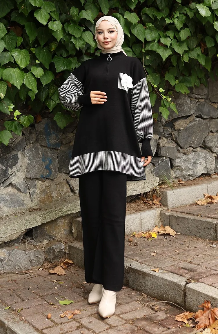 Knitwear Floral Appliqued Tunic Trousers Two Piece Set 1009-01 Black 1009-01