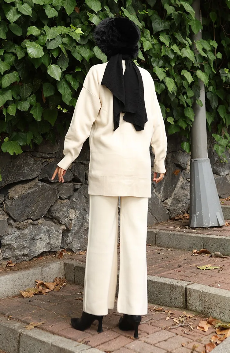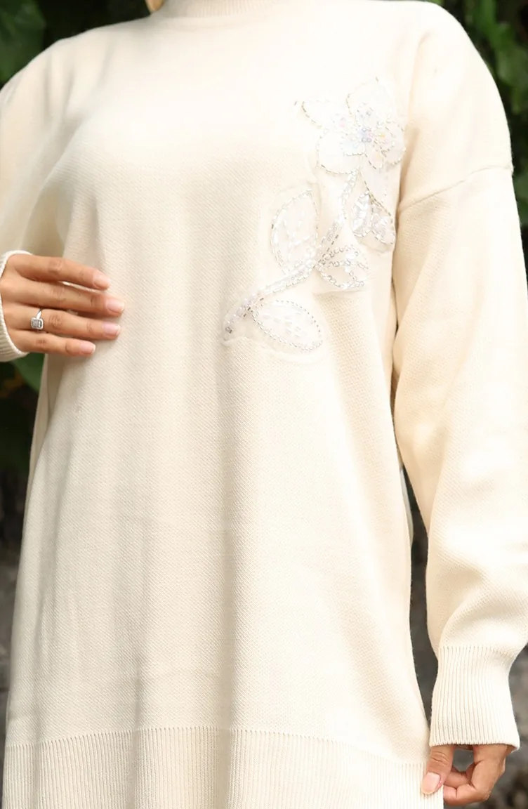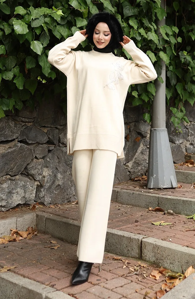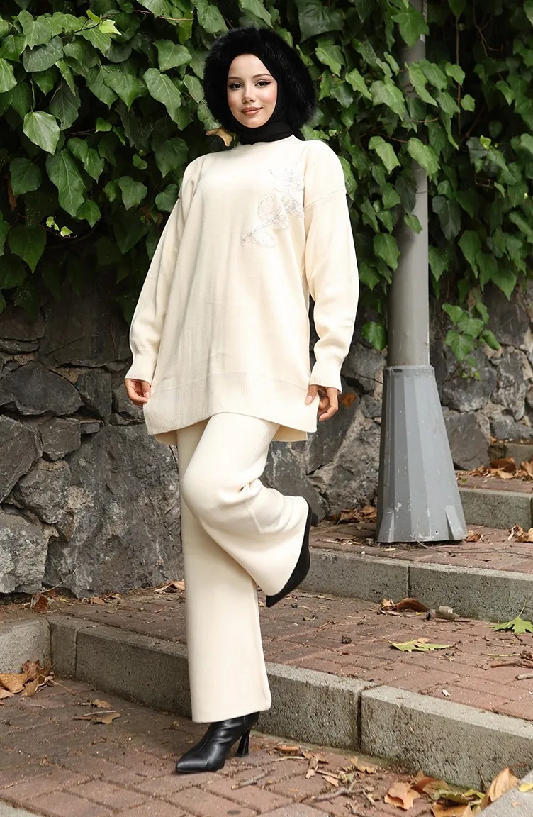 Knitwear Floral Embroidered Tunic Trousers Two Piece Set 1067-06 Beige 1067-06